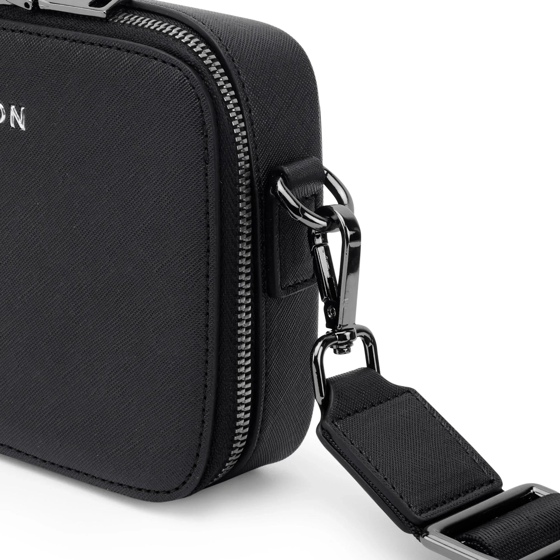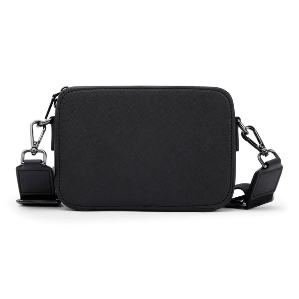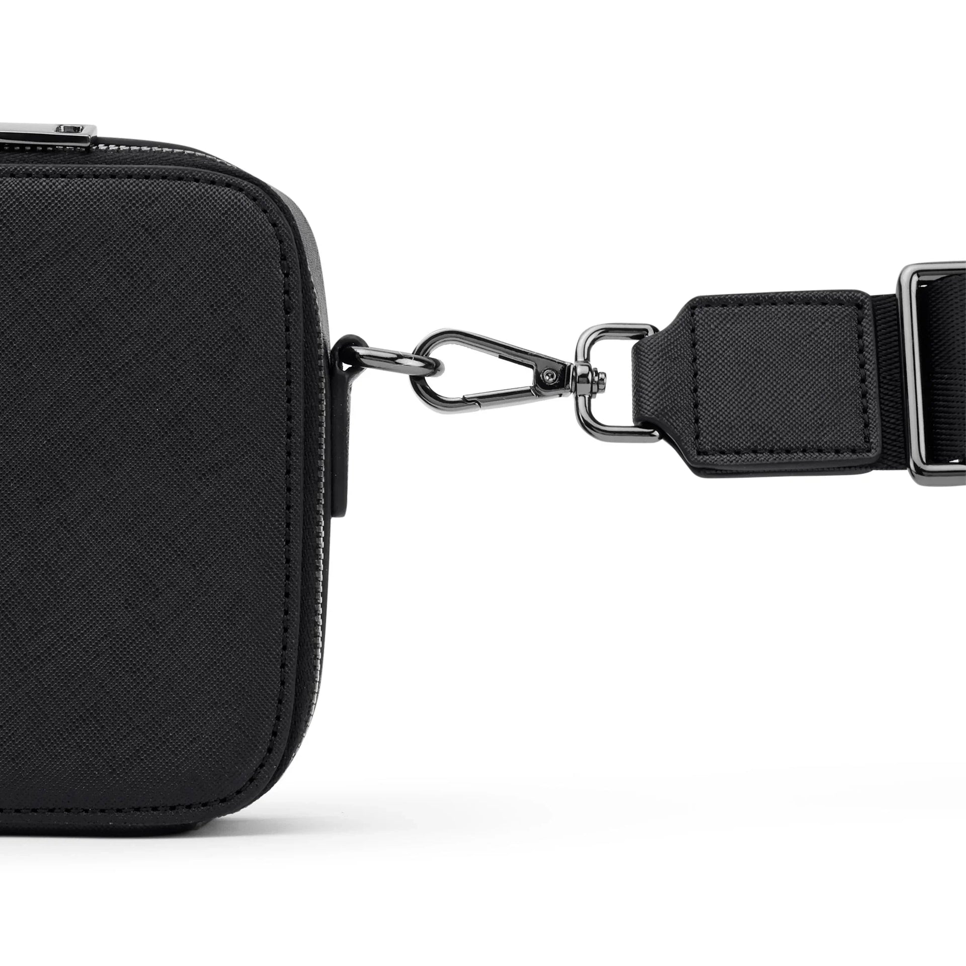 Its adjustable strap makes it comfortable to wear. Carry it across your body or over your shoulder. The hardware is durable metal for a bold accent. The premium material resists scratches, which keeps your trendy accessory small black bag looking new.