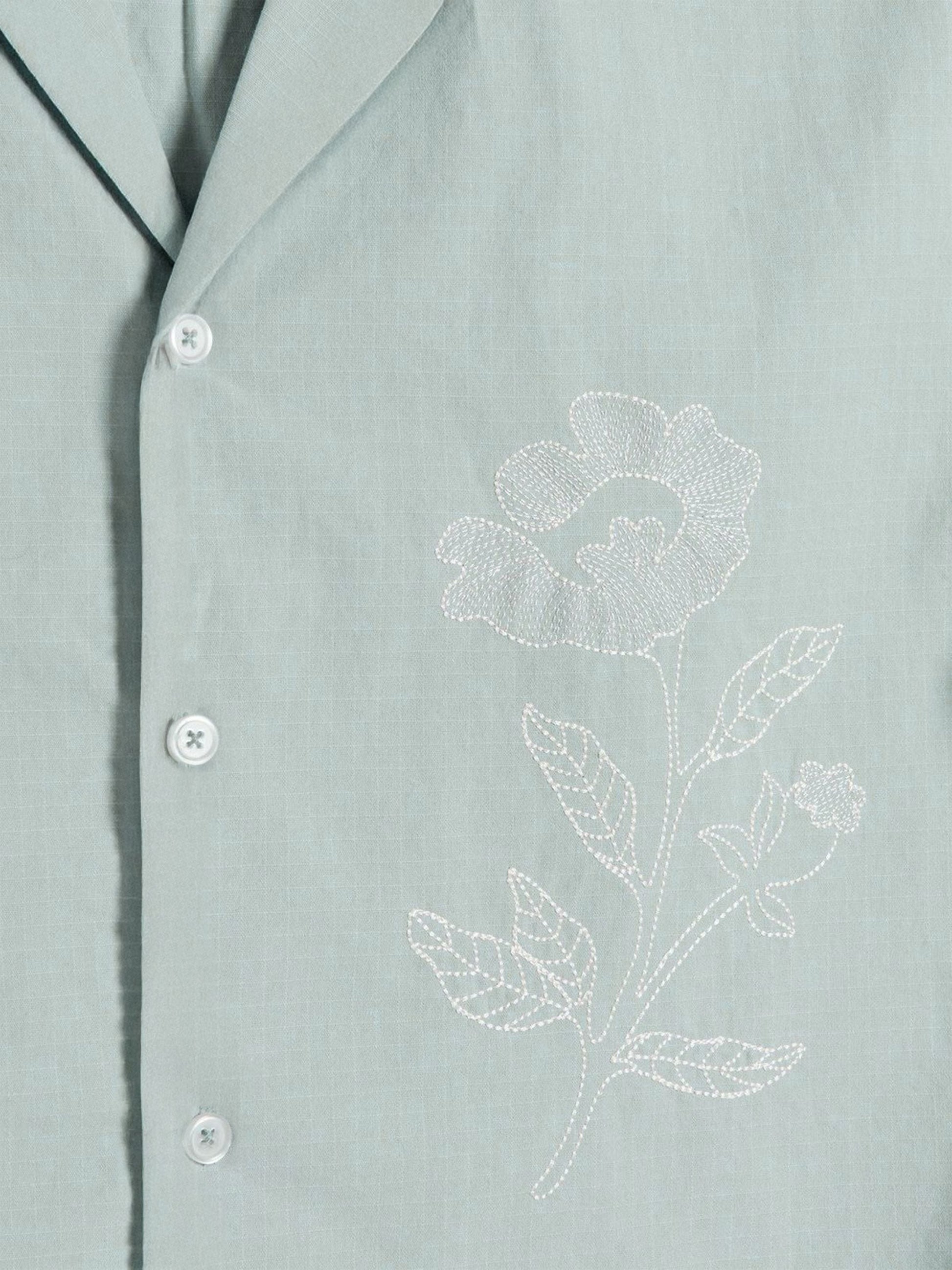 Breathe effortless elegance into your wardrobe with the Botanic Bloom Box-Fit Linen Shirt. Crafted from a lightweight cotton-linen blend, this shirt offers a relaxed boxy fit for all-day comfort. The delicate floral embroidery on the front adds a refined yet minimalistic charm, making it perfect for both casual outings and elevated summer looks. Featuring a Cuban collar and tonal buttons, this piece blends sophistication with a laid-back appeal.