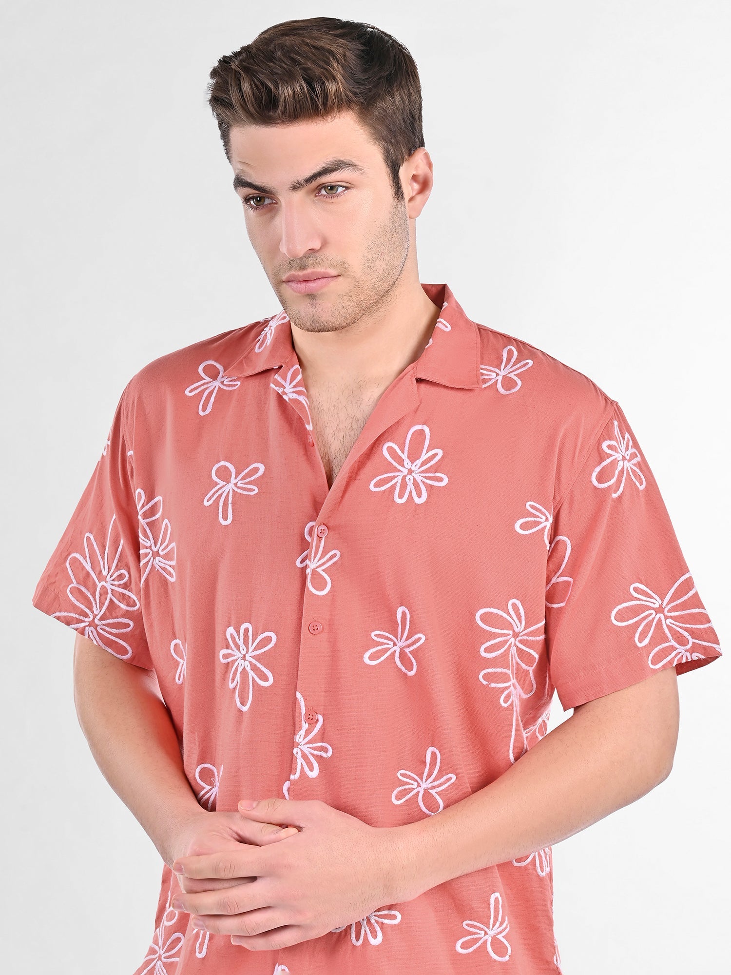 Box-Fit Floral Bloom Linen Shirt in Coral