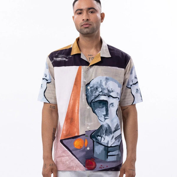 What's the story here? This unique cotton shirt transforms into a canvas of abstract marvels, breathing life into marble statues and forgotten artifacts. Swirls of color and form dance, reimagining classical elegance in a contemporary tapestry. Each thread tells a tale of timeless artistry, where history meets innovation in wearable abstraction.