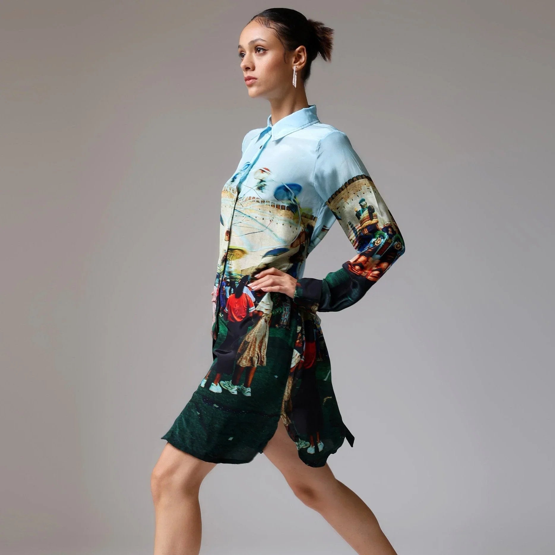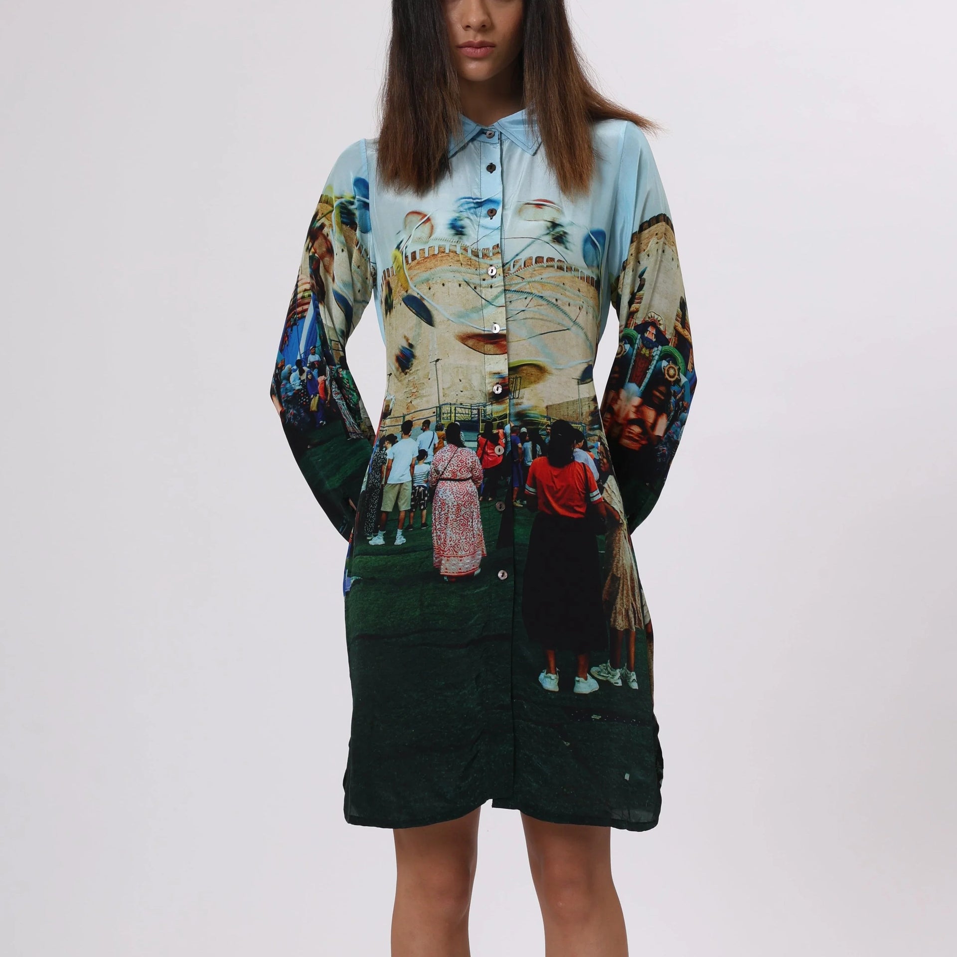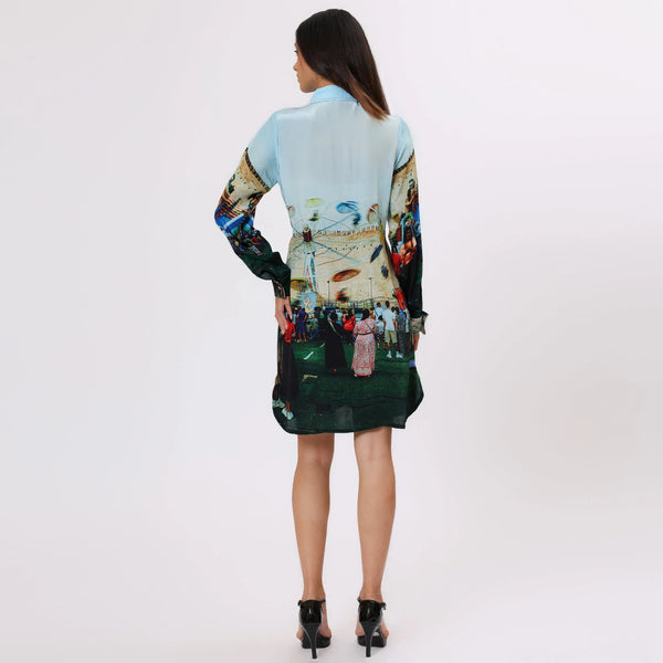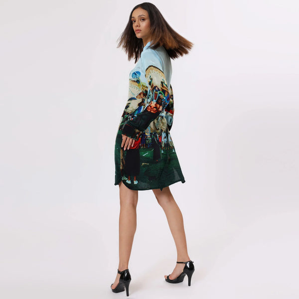 This premium long shirt dress, made from natural Bemberg Satin, drapes beautifully over the body with an elegant fall. The design celebrates the joy and vibrance of a carnival, brought to life through a stunning blend of colors and a unique illustration style. Whether you're wandering sunlit streets or heading to an evening affair, this golden-brown shirt dress brings a perfect balance of comfort and chic.