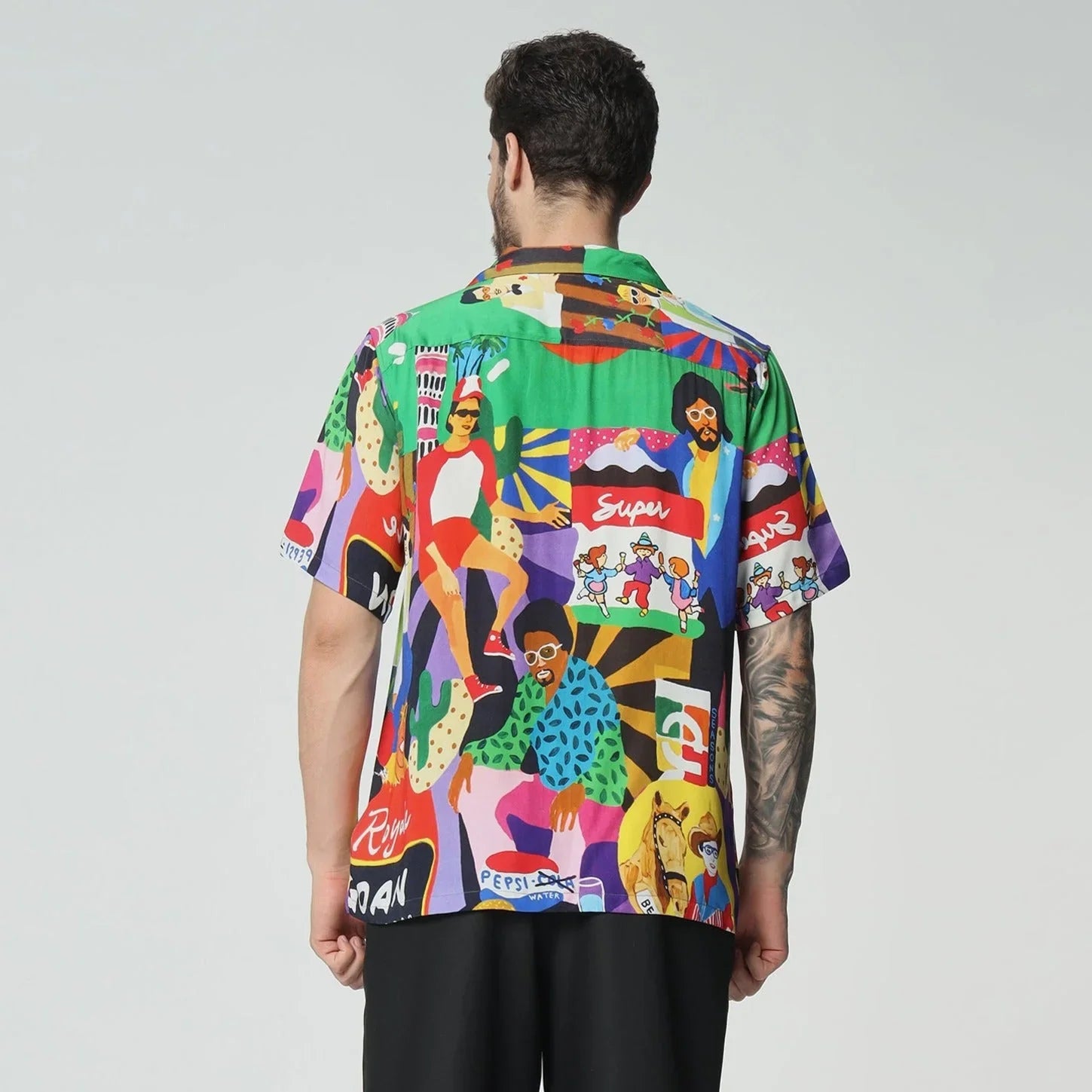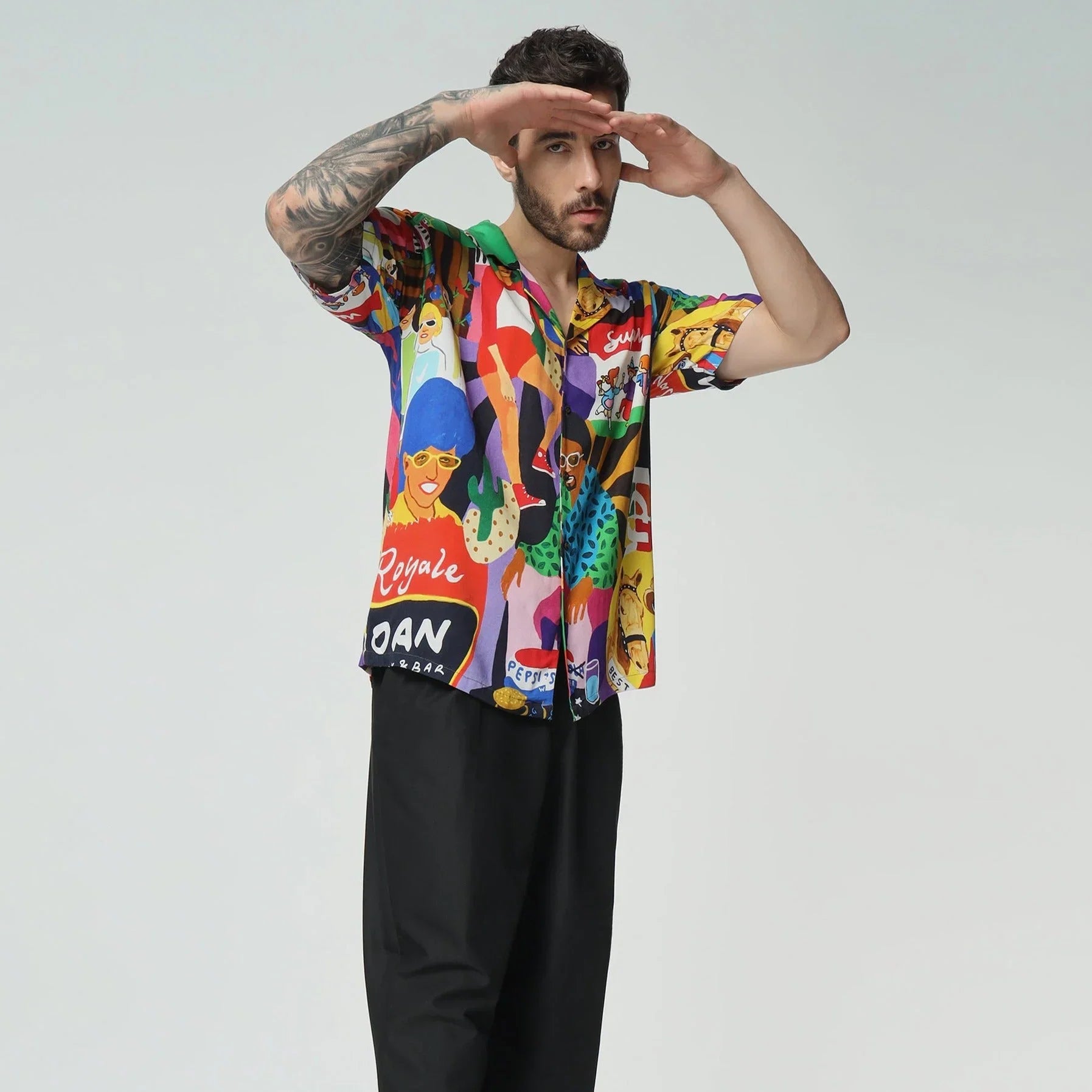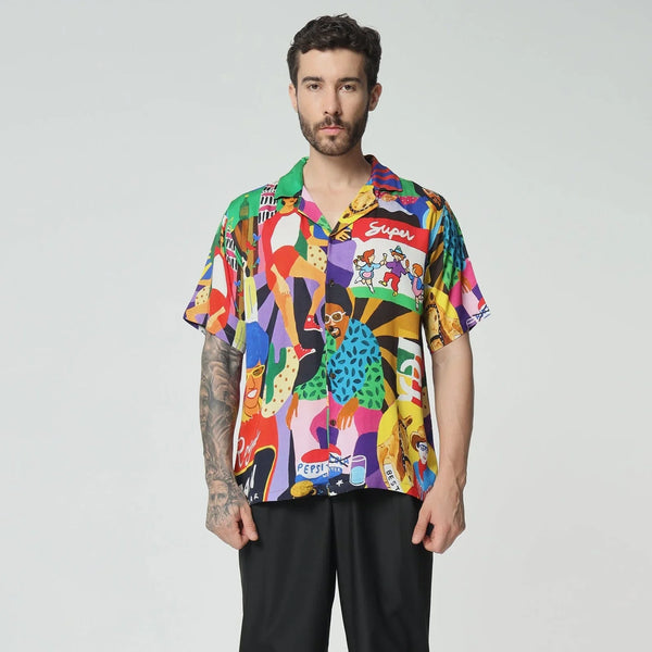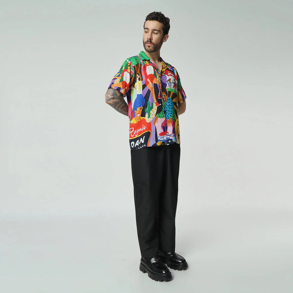 What's the story here? Embodying the vibrant spirit of Goan beach life, this shirt bursts with lively hues and scenes of carefree enjoyment along the shore. Each stitch captures the essence of sun-soaked days, where people lounge and laugh, immersed in the relaxed rhythm of coastal living.