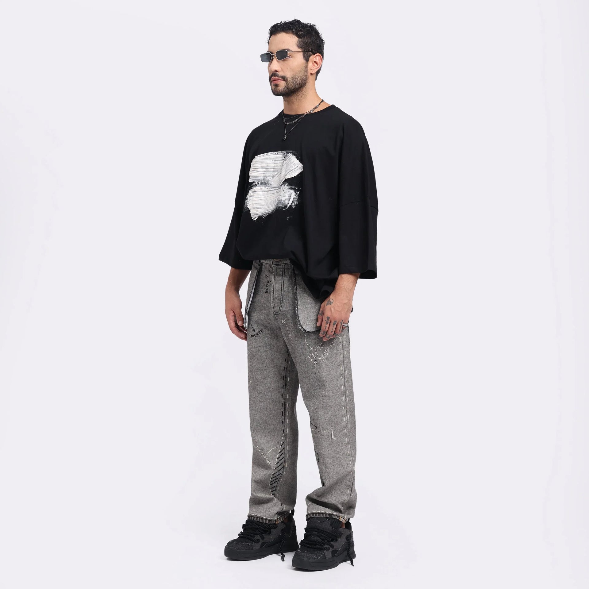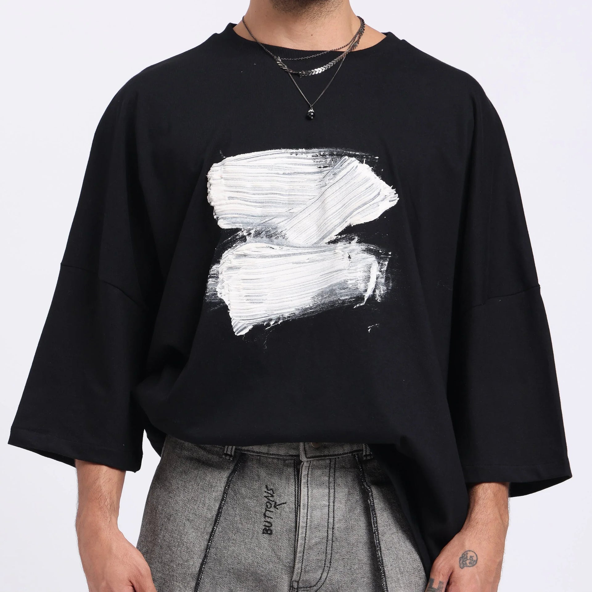 Crafted with a bold hand-done puff print, this oversized black t-shirt features raw, artistic brushstroke detailing in white. Each piece is uniquely made by hand, ensuring no two shirts are the same. Made from soft, breathable cotton with a relaxed silhouette—perfect for elevating everyday streetwear with a touch of artistic flair.