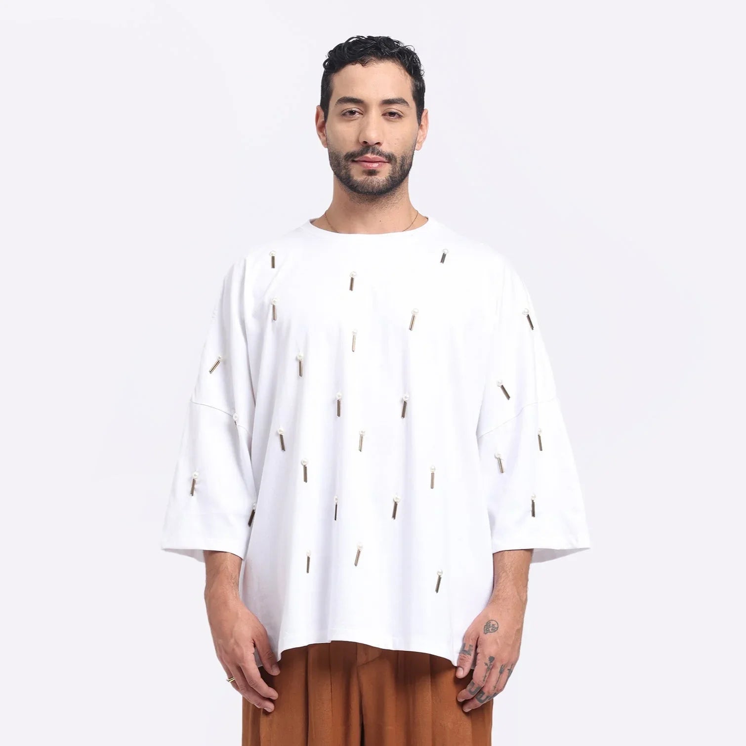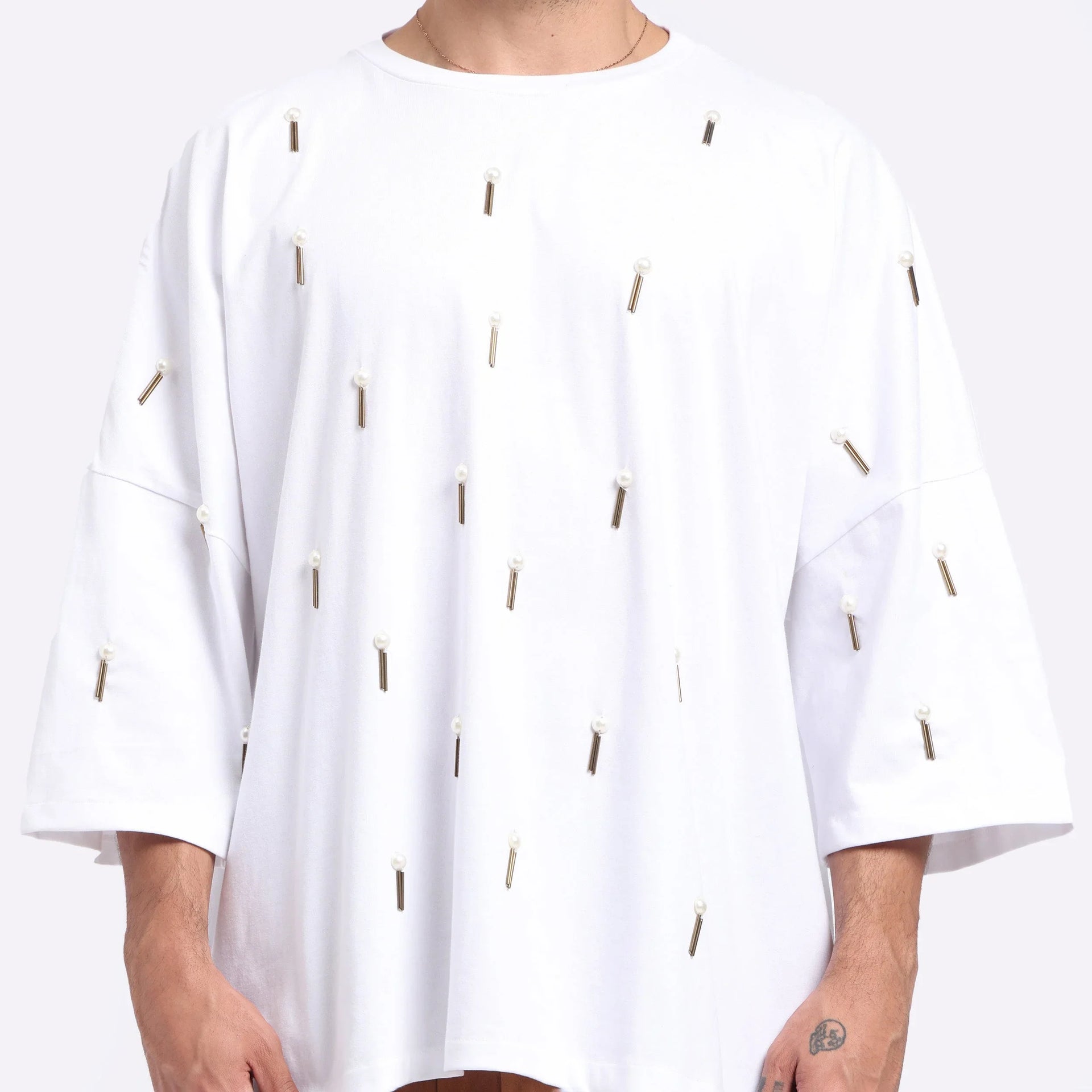 A modern canvas elevated with detail. This oversized white tee features intricate hand embroidery using tubular beads ("pipes") that create a striking linear texture across the fabric. Minimal in tone but rich in craftsmanship, it's a bold yet refined statement in contemporary design.