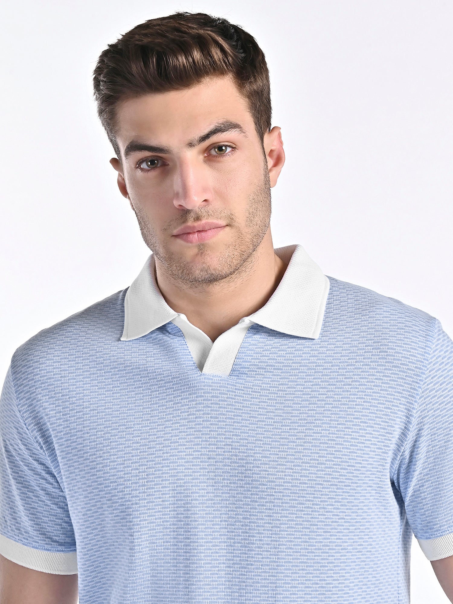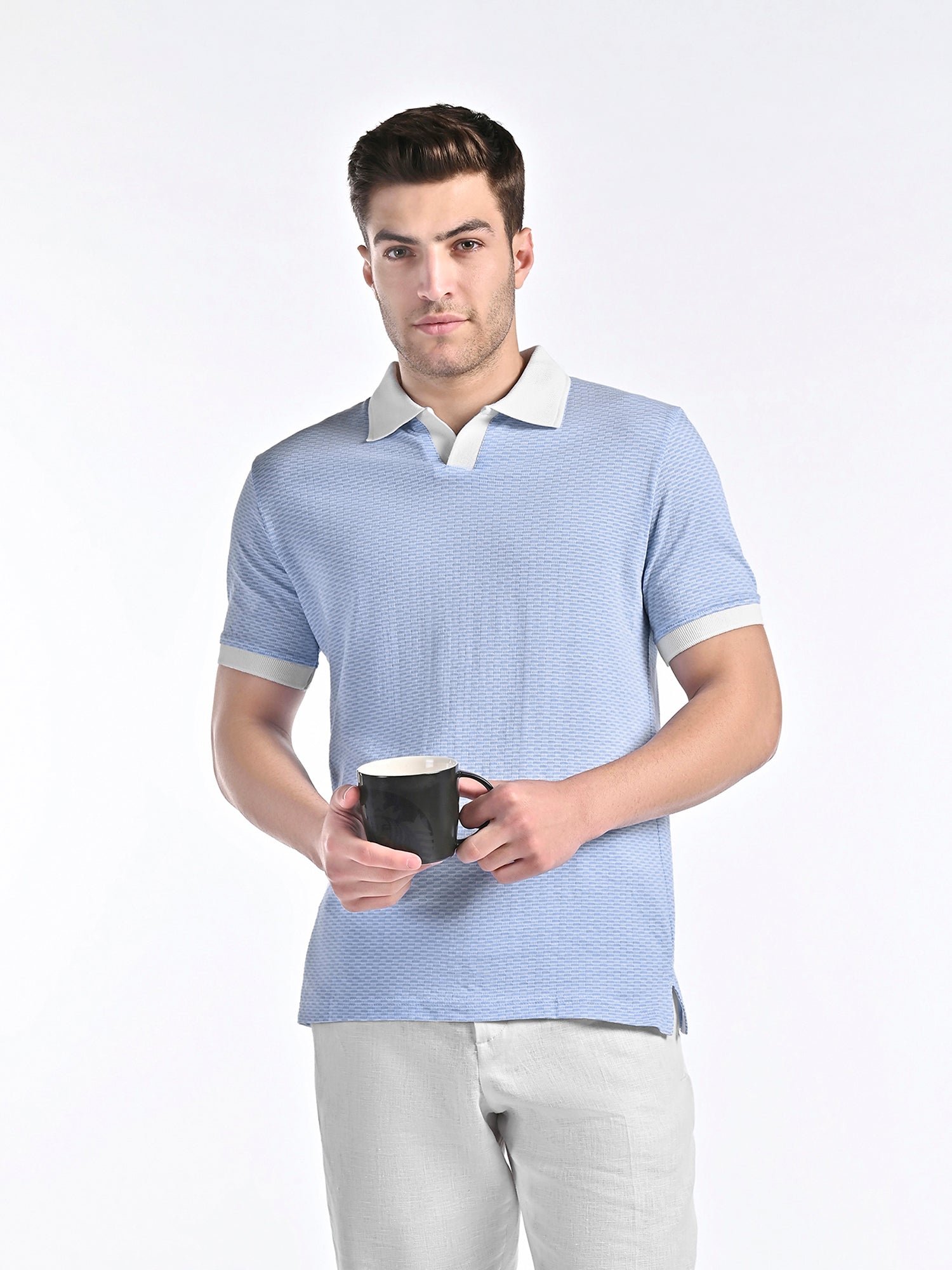 Step into effortless sophistication with the Textured Mykonos Blue Polo, a masterpiece of craftsmanship and design. Made from 100% yarn-dyed mercerised long-staple combed cotton, its intricate blend of blue and white yarns creates a distinctive texture. With its Johnny collar and striking contrast details, this polo redefines modern refinement.