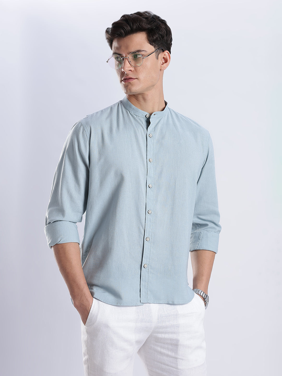 Kyoto Linen Mandarin Shirt in Shibuya Blue