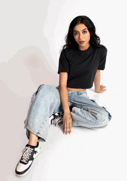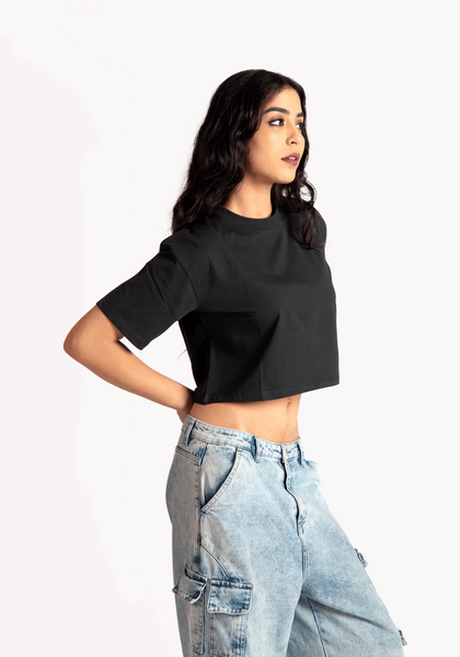 This oversized cropped t-shirt for women is all about versatility. Dress it up with a statement necklace for a night out. Throw it over leggings for a laid-back vibe. The solid black color makes it easy to mix and match. You can layer it with jackets or style it solo when the weather is warm.