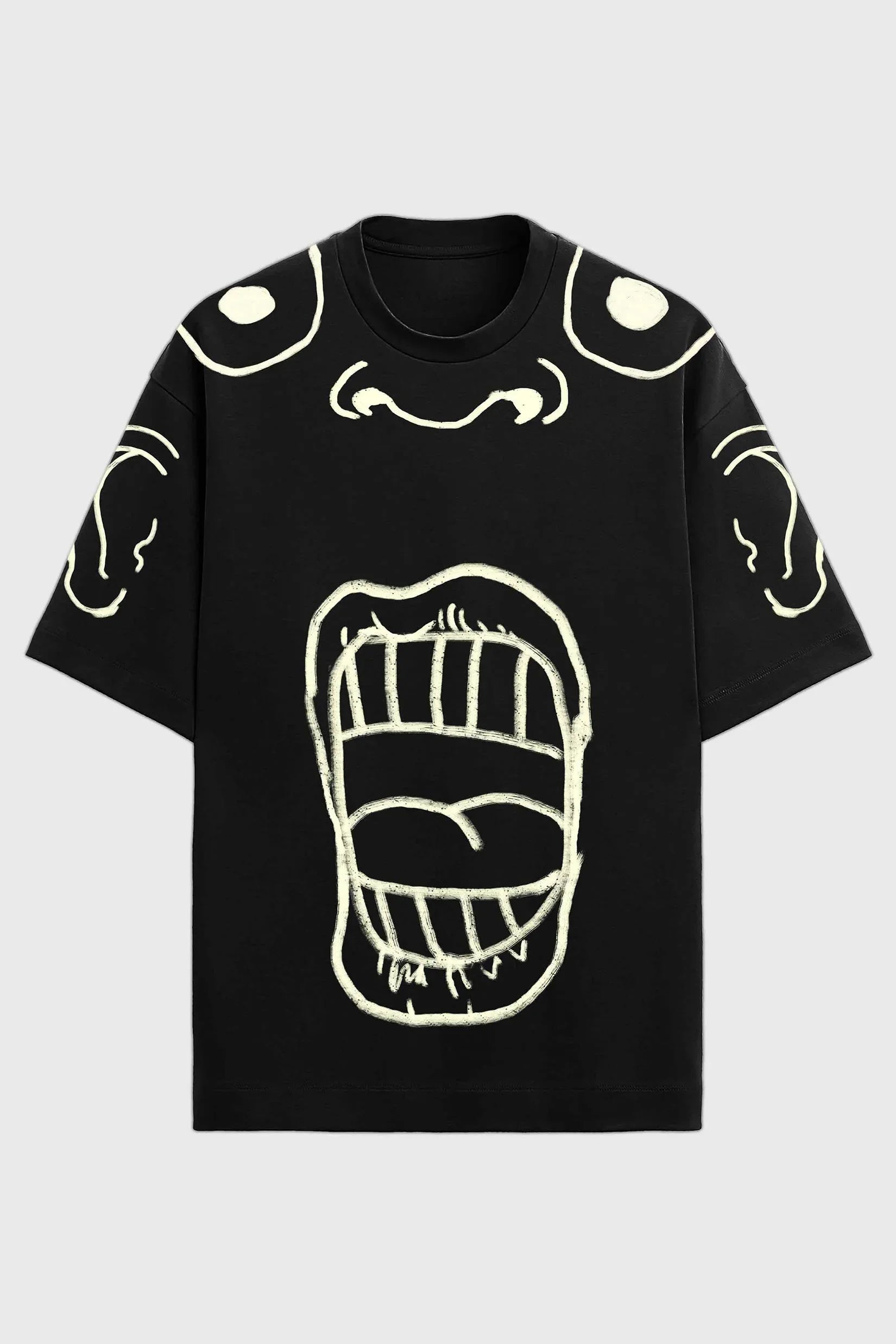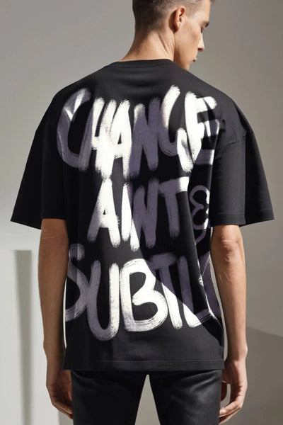 Colour: BlackMaterial: 100% Premium Terry CottonOccasion: Casual, Streetwear, Everyday WearPattern: Graphic PrintNeckline: Crew NeckFit: Oversized FitSleeve Type: Short SleevesCare Instructions: Machine wash cold; do not bleach; wash inside out; tumble dry lowPack Contains: 1 T-ShirtCountry Of Origin: India