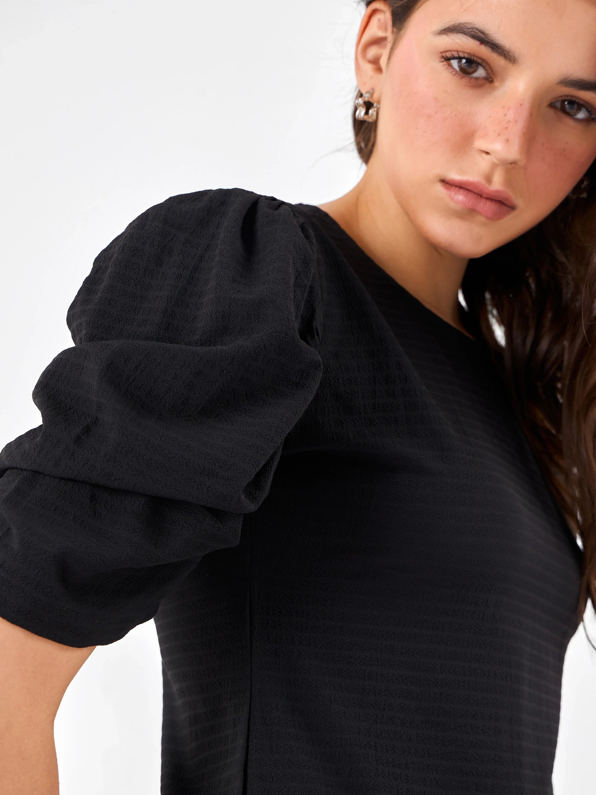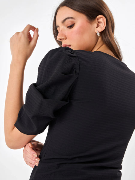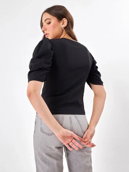 Colour: Black Material: Cotton Occasion: Casual / Everyday Neckline: Round Neck Pattern: Solid / Eyelet DetailFit: Regular Fit Sleeve Type: Puff Sleeves Care Instructions: Machine wash cold, tumble dry low, avoid high heat ironing, wash with similar colours Pack Contains: 1 TopCountry Of Origin: India