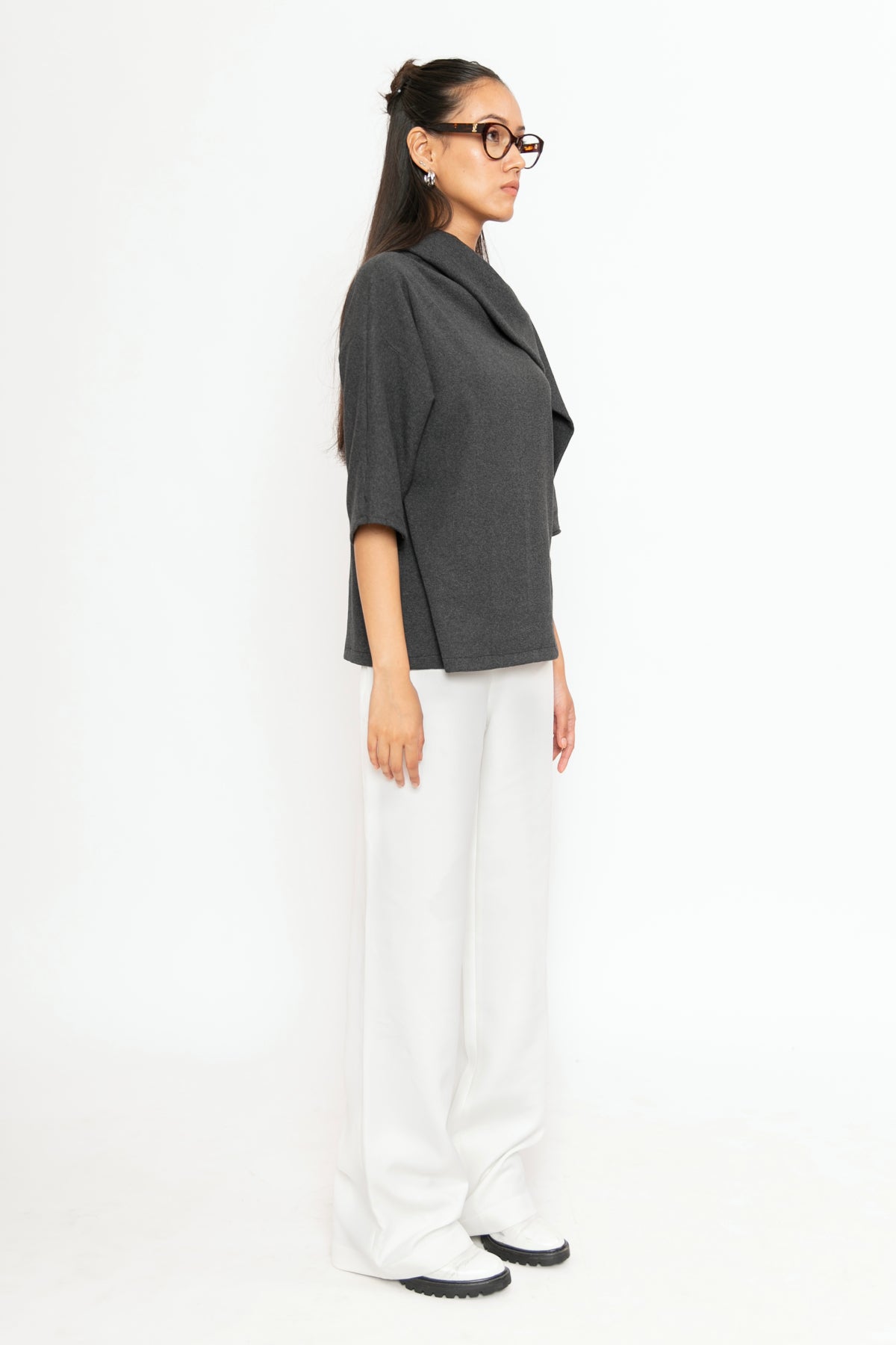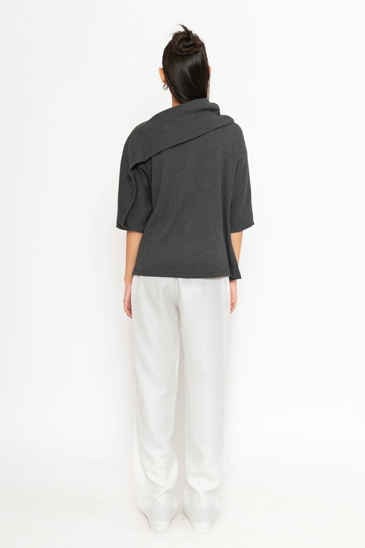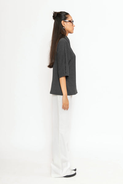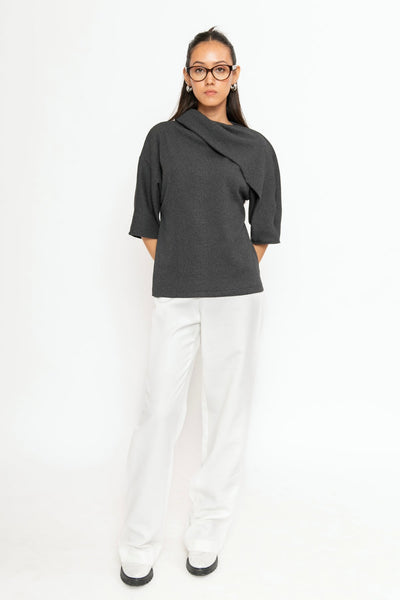 A minimalist charcoal grey top with a relaxed fit, three-quarter sleeves, and an asymmetric folded neckline. Crafted from soft, breathable fabric, it offers all-day comfort with effortless style.