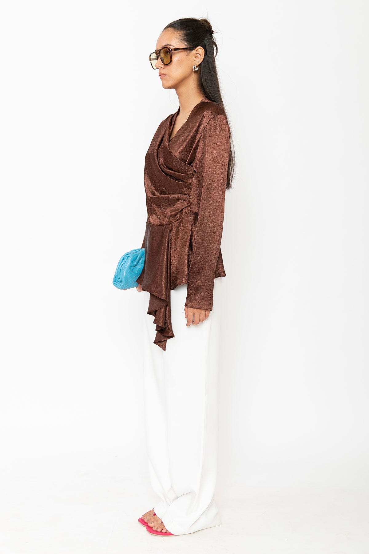 A deep brown satin top with a wrap-style front and flared peplum hem. Its luxurious sheen and asymmetrical draping add elegance and depth—perfect for evening or formal occasions.