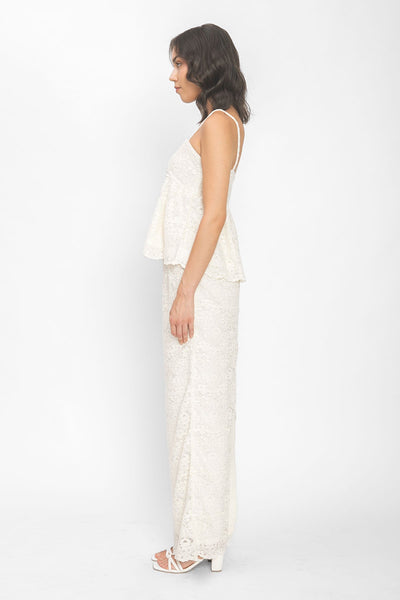 A Strappy peplum top with delicate noodle straps and tonal Schiffli embroidery. Paired with a long straight skirt featuring all-over schiffli embroidery and a back slit for added comfort.
