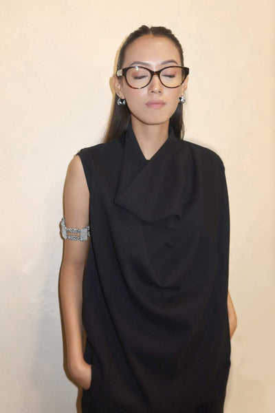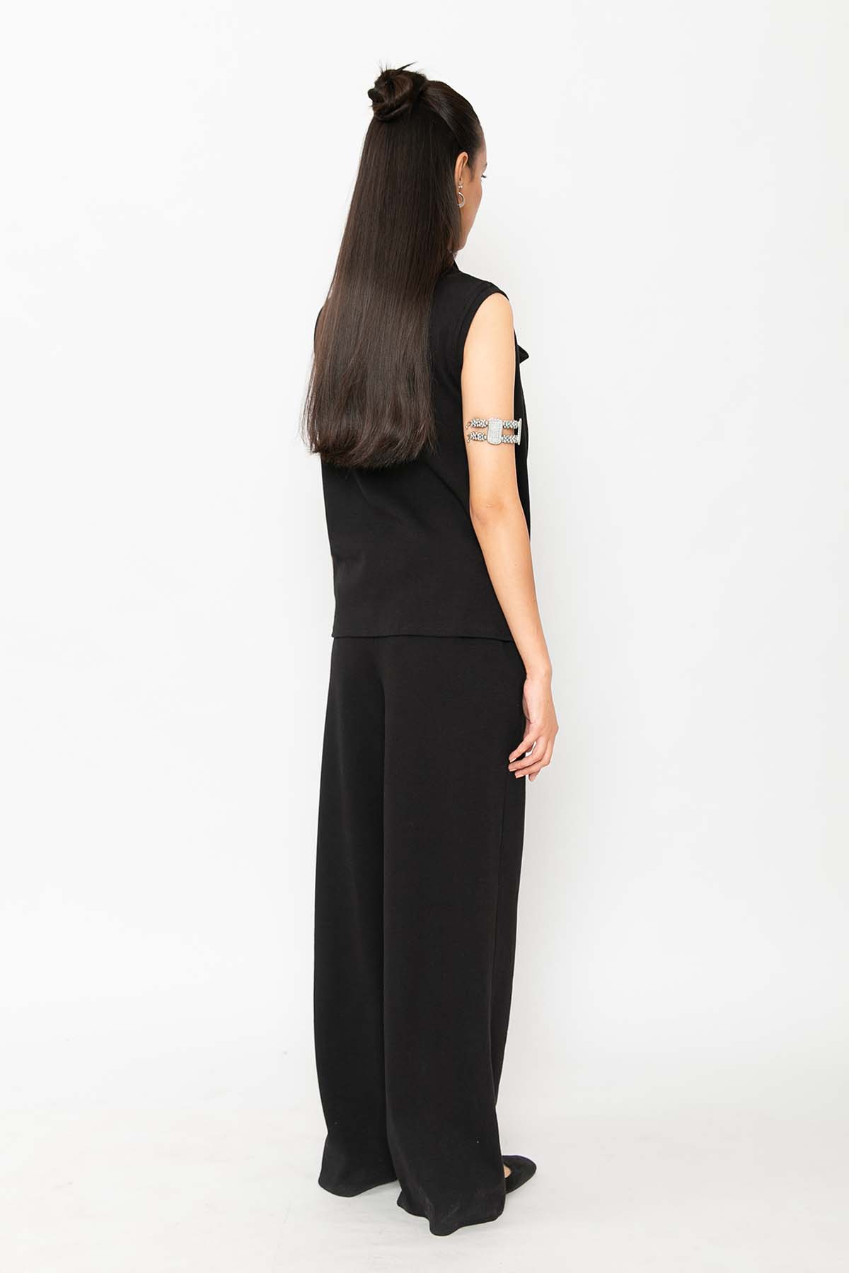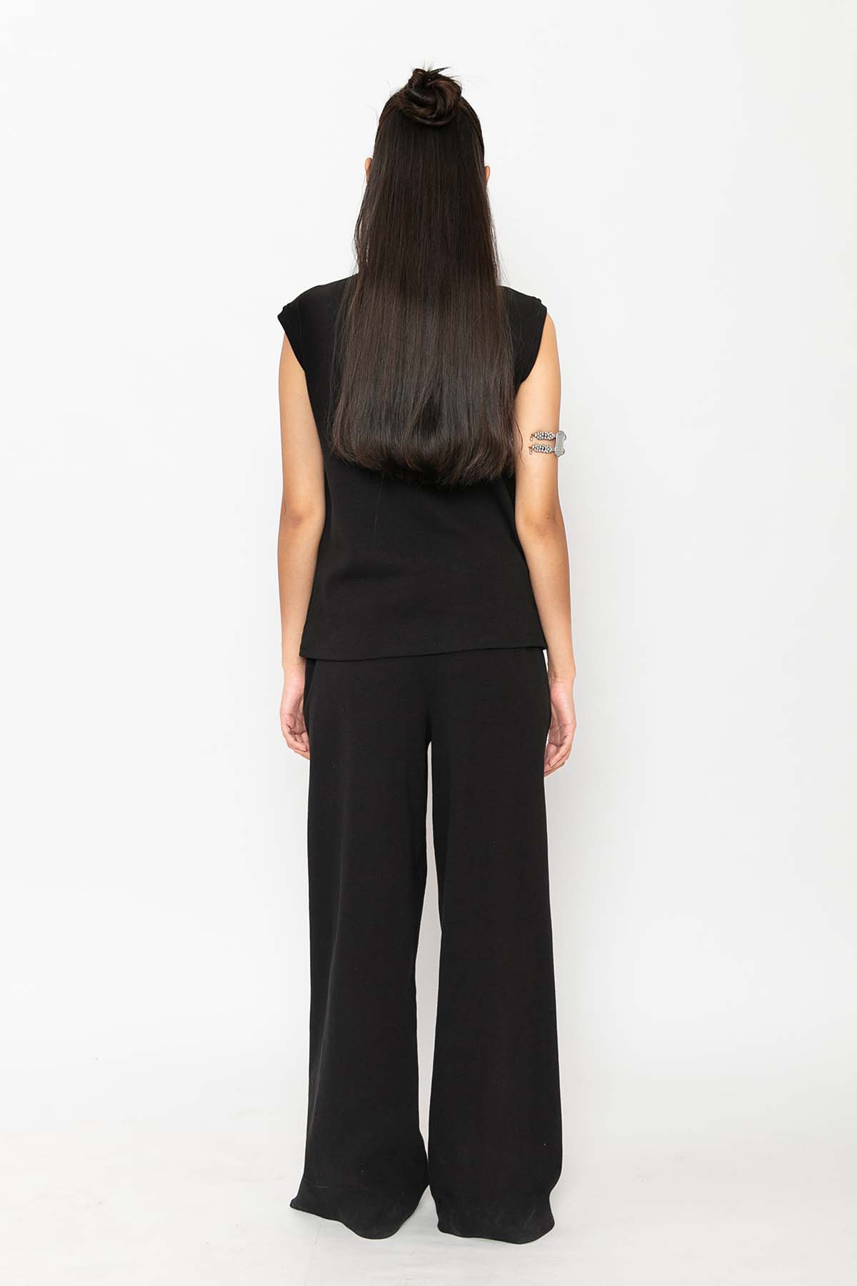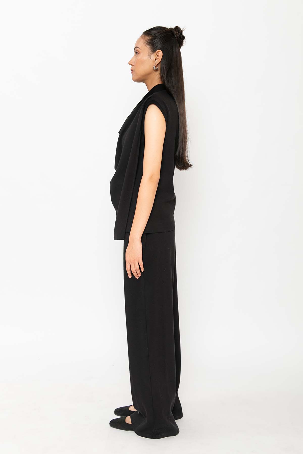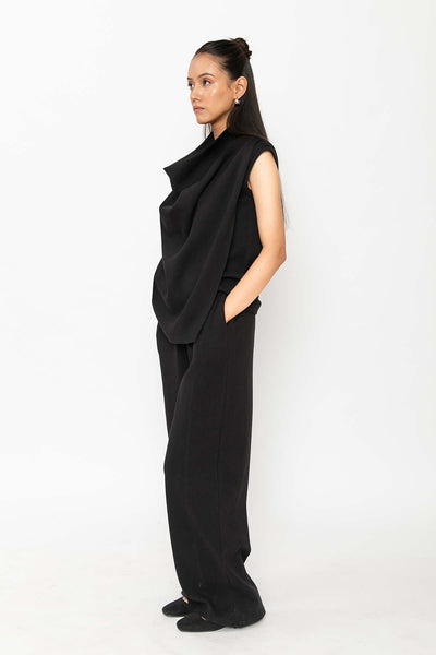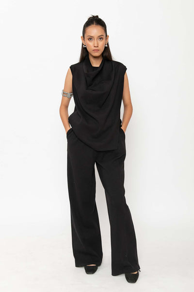 A sleeveless black top with a softly draped cowl neckline that adds elegance and fluidity. Made from lightweight, comfortable fabric, it’s a versatile piece for both casual and refined looks.