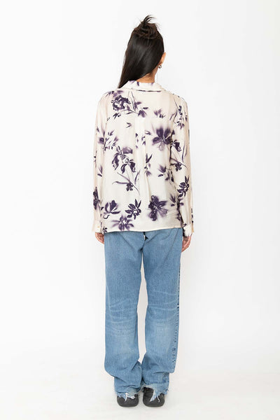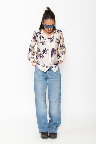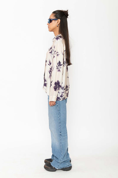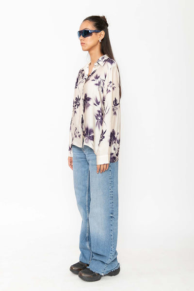 A relaxed-fit button-down shirt in soft ivory with a subtle deep purple floral pattern. Crafted from lightweight, satin fabric, it blends comfort with understated sophistication—ideal for casual or dressy occasions.