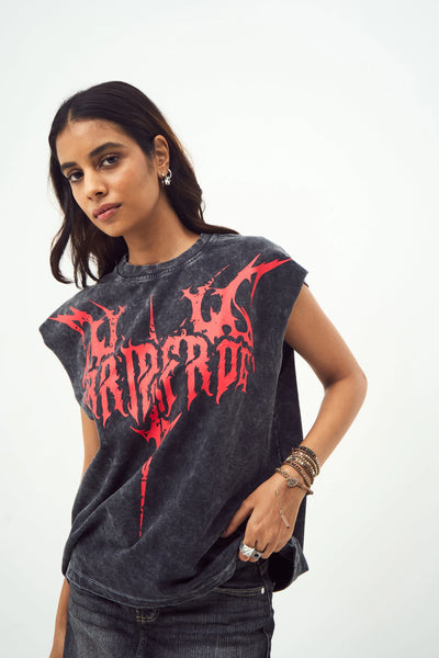 Colour: Black (Acid Wash)Material: 100% Cotton (260 GSM)Occasion: Casual, StreetwearPattern: Gothic Screen PrintNeckline: Round NeckFit: Oversized Muscle FitSleeve Type: SleevelessCare Instructions: Reverse wash only, machine wash cold with similar colours, non-chlorine bleach, tumble dry low, warm reverse iron if requiredPack Contains: 1 Muscle TeeCountry Of Origin: IndiaThe male model (5'10") is wearing size M, while the female model (5'5") is wearing size S