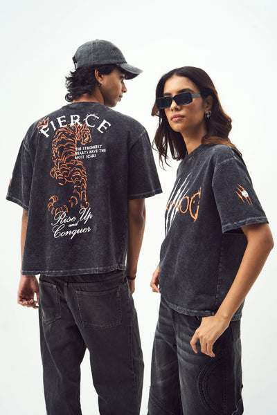 Make a bold statement with the Fierce Tiger Acid Wash T-Shirt. Crafted from premium 260 GSM cotton French terry, this tee features a striking black acid-wash base with bold Puff/HD tiger print. Designed with a classic round neck and regular fit, it delivers durable comfort and standout streetwear style for everyday wear.