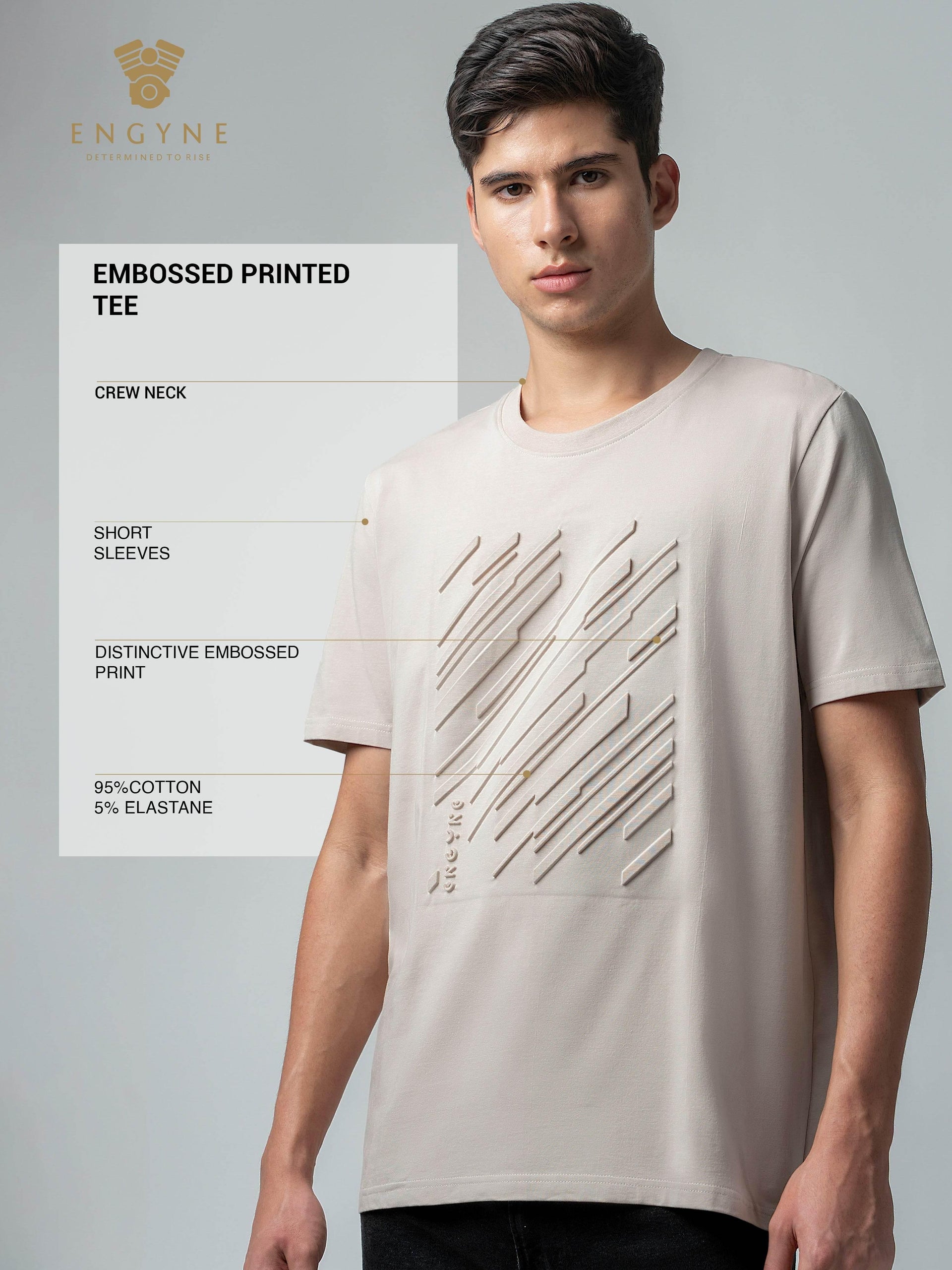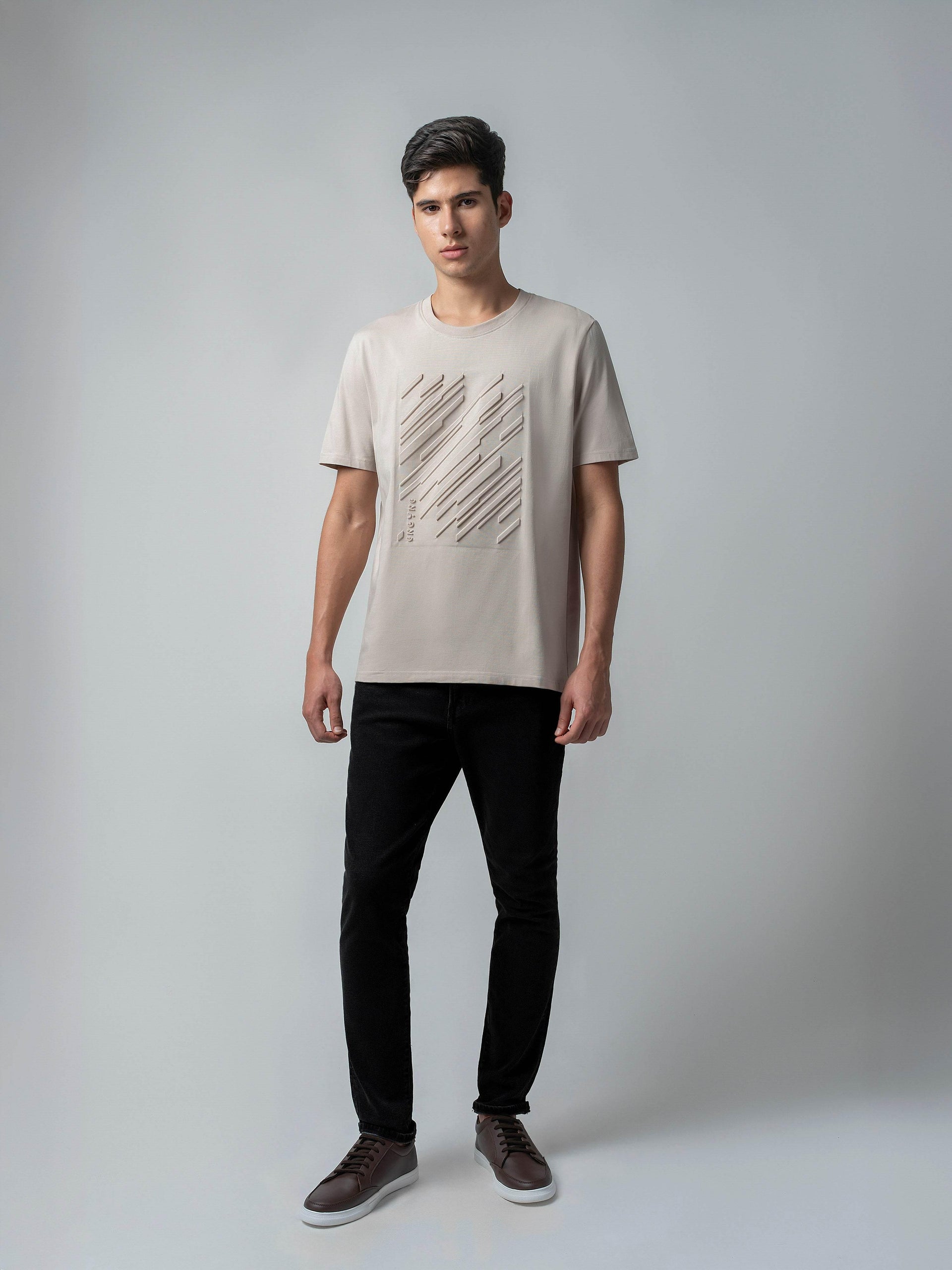 Enhance your everyday wardrobe with this premium Rougen Cotton Lycra T-shirt, designed with a unique embossed print that adds subtle texture and modern appeal. Soft, stretchy, and exceptionally comfortable, this sand-colored crew-neck tee is perfect for casual outings, daily wear, or relaxed weekend styling with effortless sophistication.