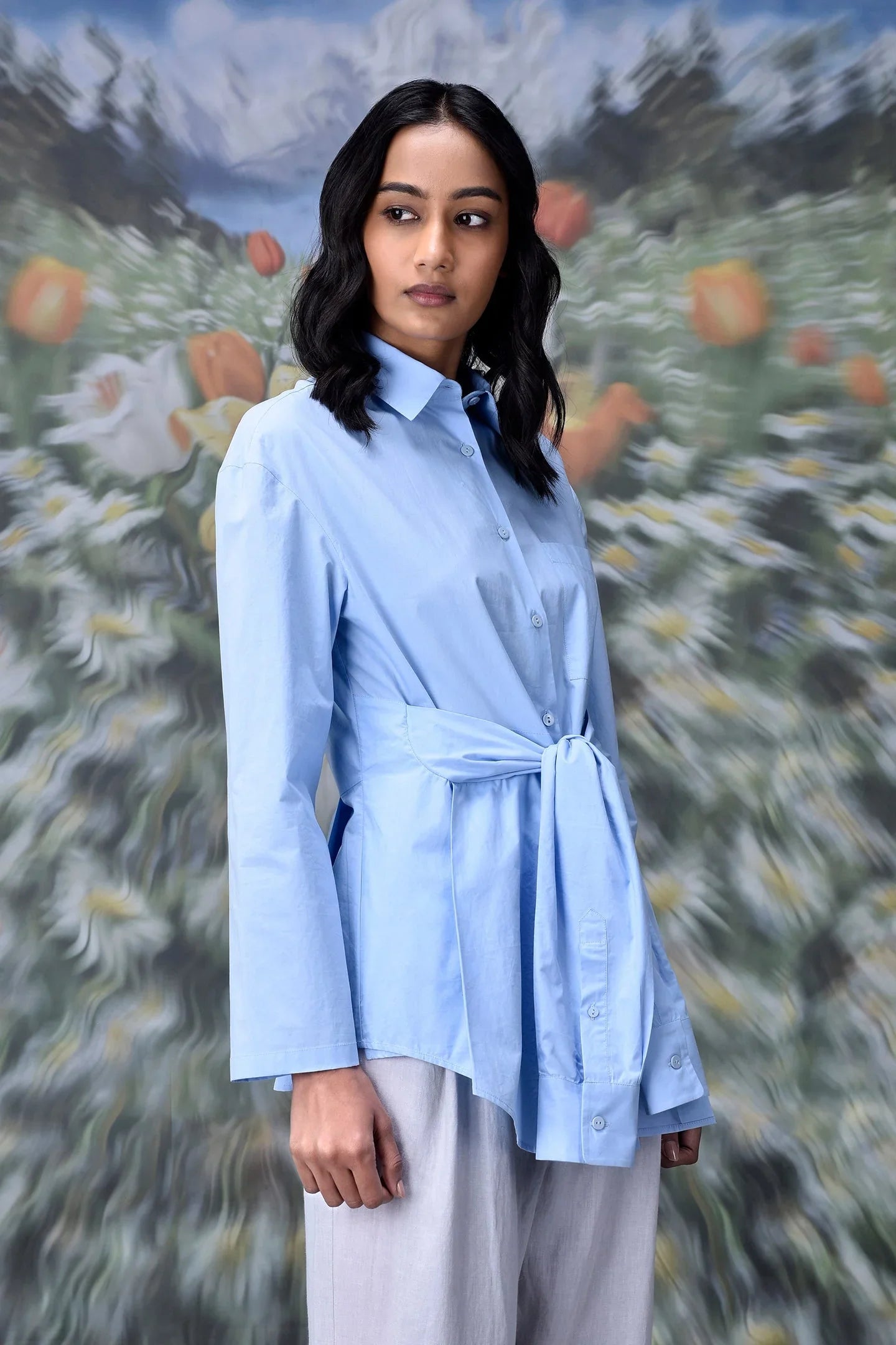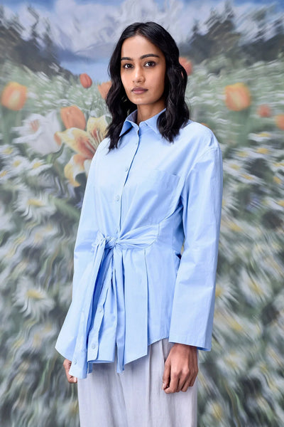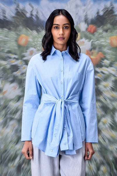 This unique casual light blue shirt for women stands out in any wardrobe. The design works well for coffee meetups or evenings out. Pair it with tailored pants for a polished look. You can also style it with denim for a relaxed outfit. Subtle details, like the crisp collar and neat cuffs, add polish.