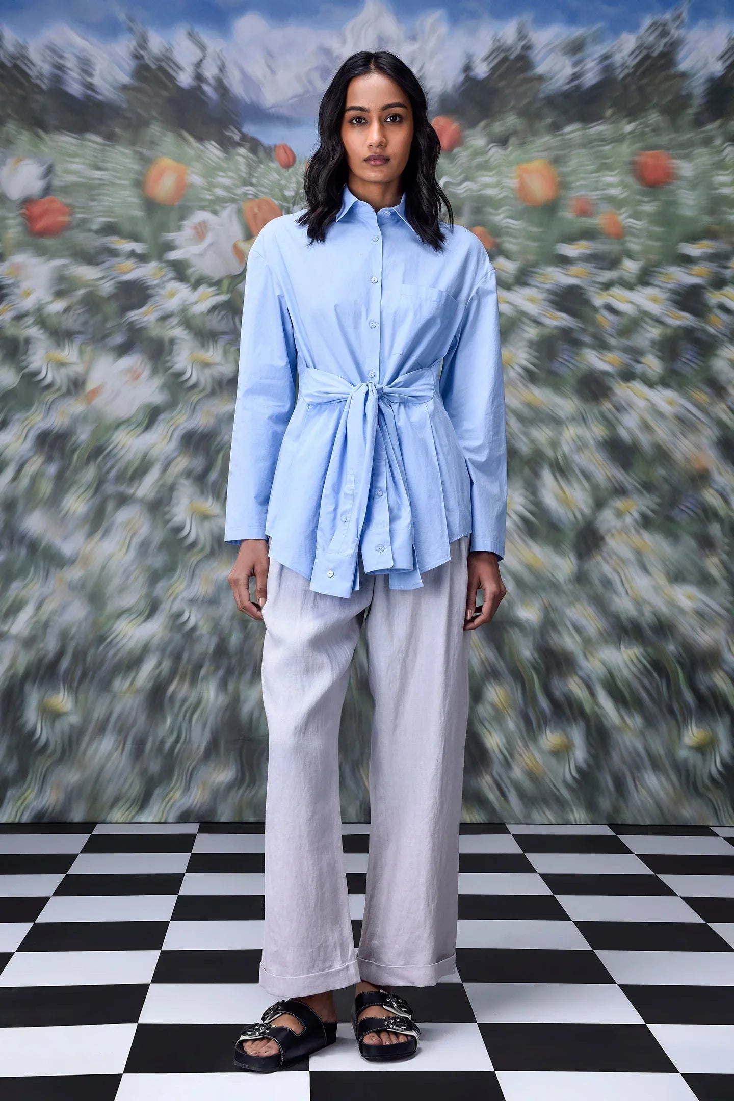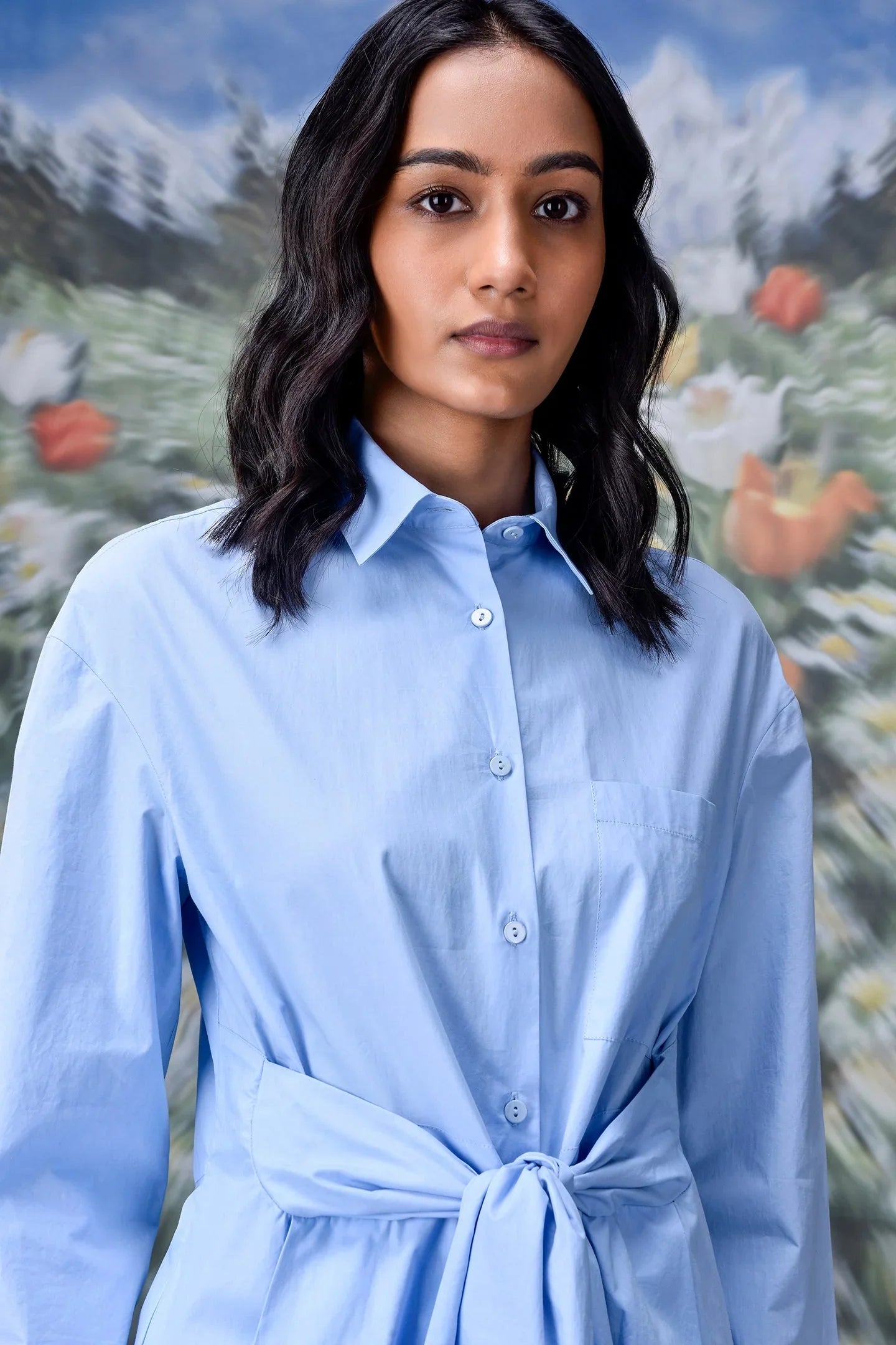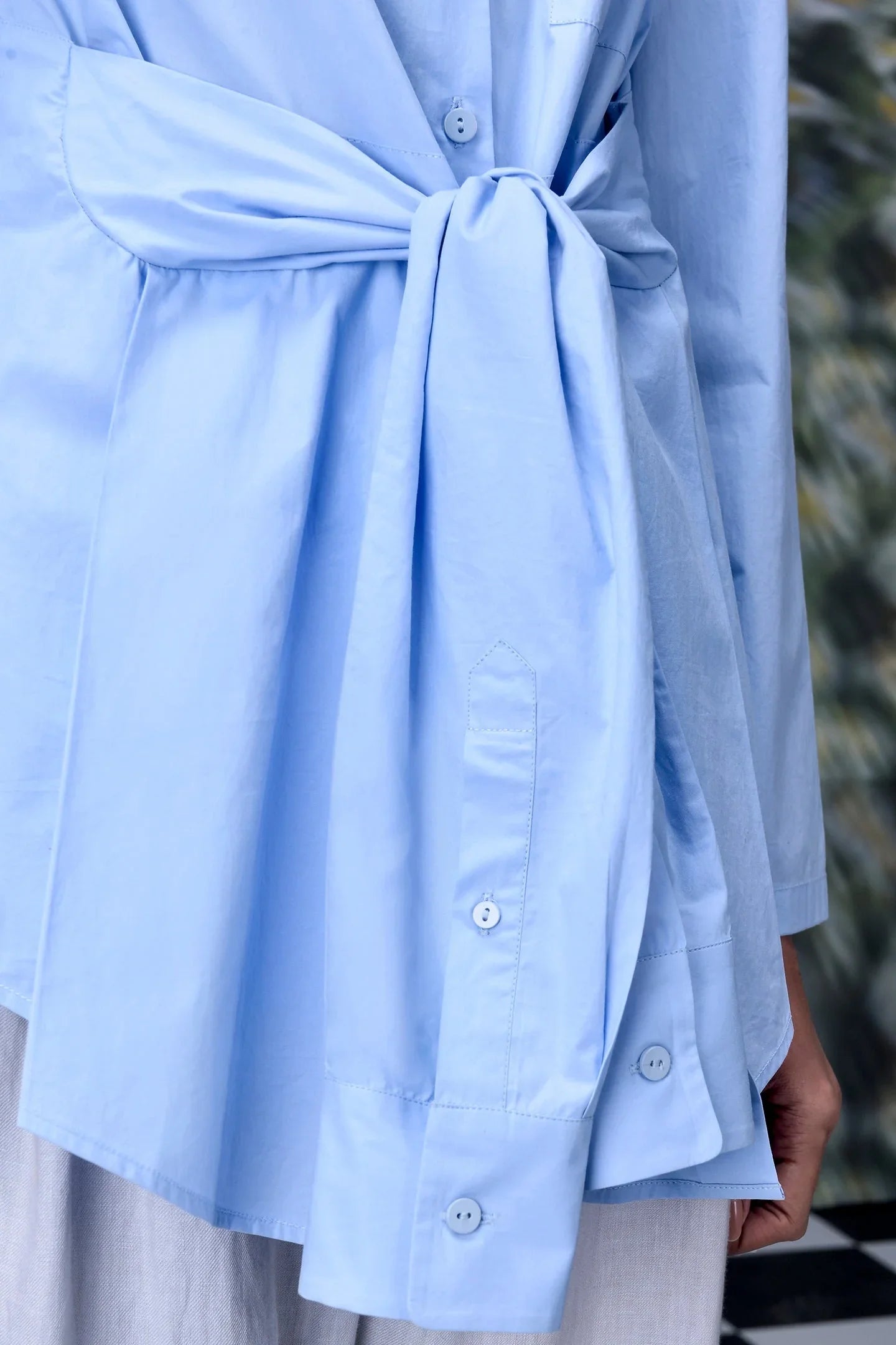 The material is lightweight and gentle against the skin. It works perfectly for all-day comfort. The shirt includes a removable belt that accentuates the waist. This feature allows for versatile styling. Wear it loose for a laid-back vibe. Use the belt for a more defined silhouette.