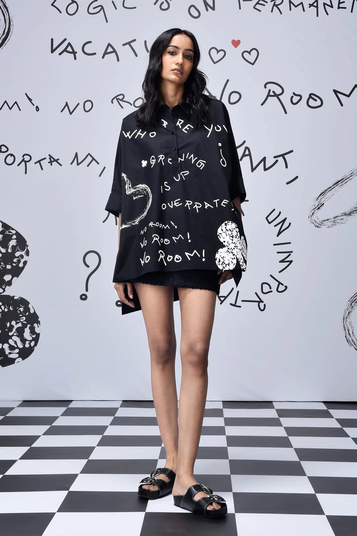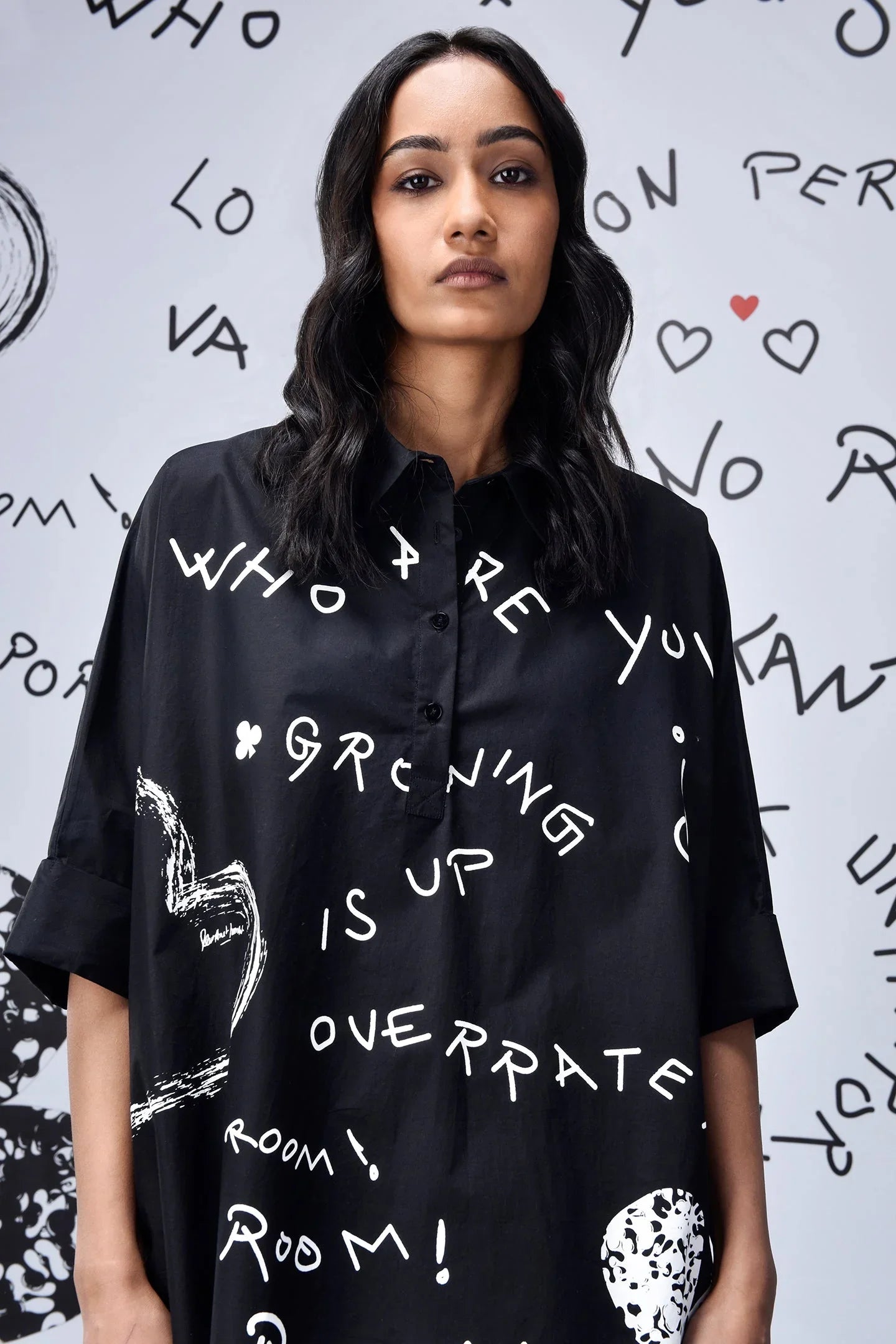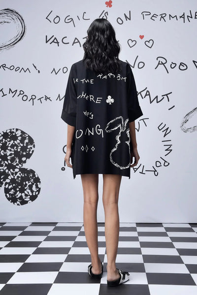 The black scribble print shirt is versatile. It looks good worn loose or tucked in. Layer it over a tank top for a relaxed look. The eye-catching design draws compliments. Statement shirts like this turn simple outfits into something special.