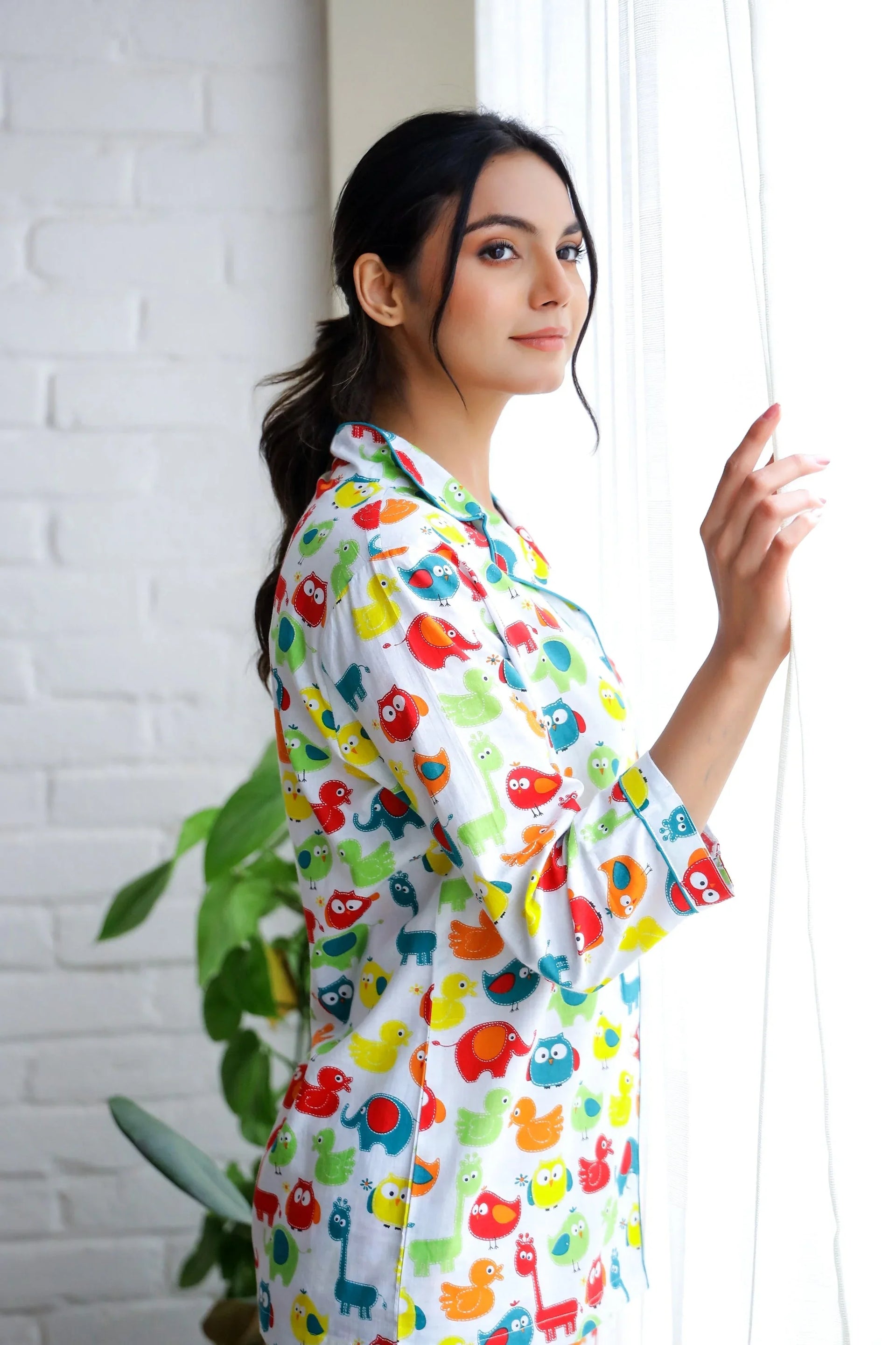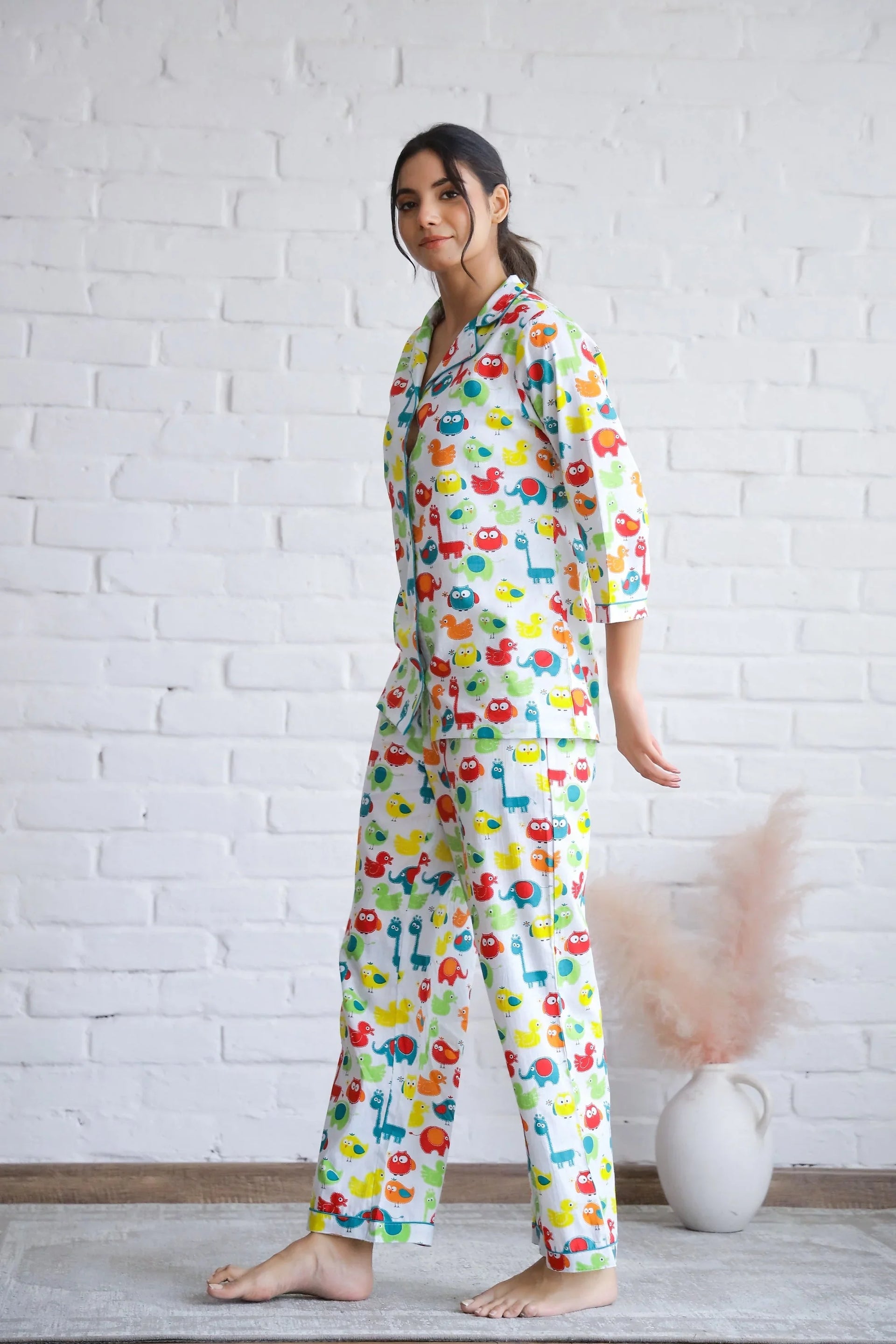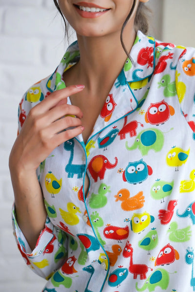 Designed thoughtfully, this animal print cotton night suit features a classic button-up top with long sleeves, accompanied by matching wide-leg pants. The relaxed fit provides ease of movement, making it perfect for curling up with a book or binging your favorite series. The high-quality fabric feels soft against the skin and is ideal for year-round wear.