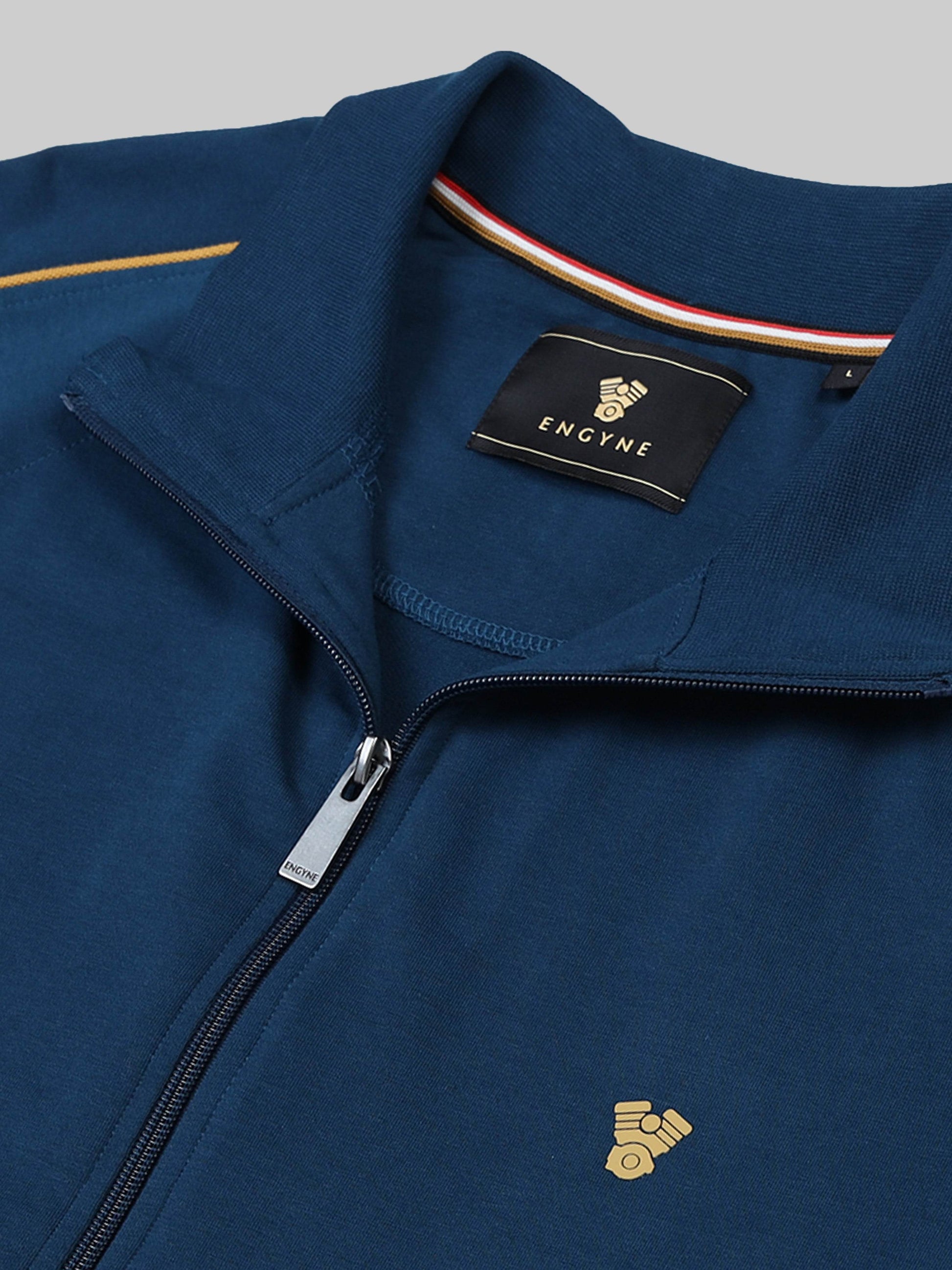 Regular-Fit High Neck Zipper Sweatshirt with Cut-and-Sew Design and Contrast Corded Piping Teal
