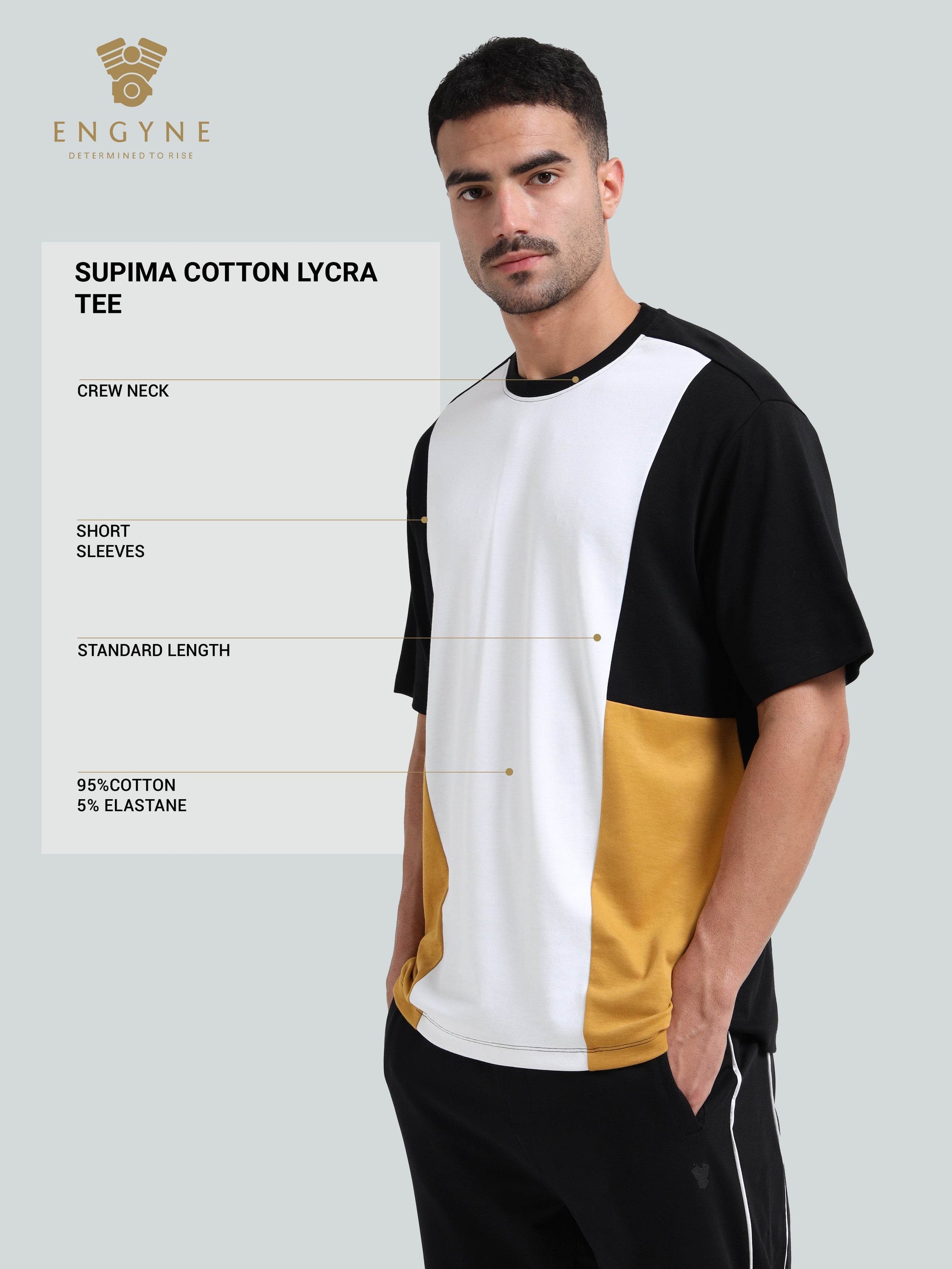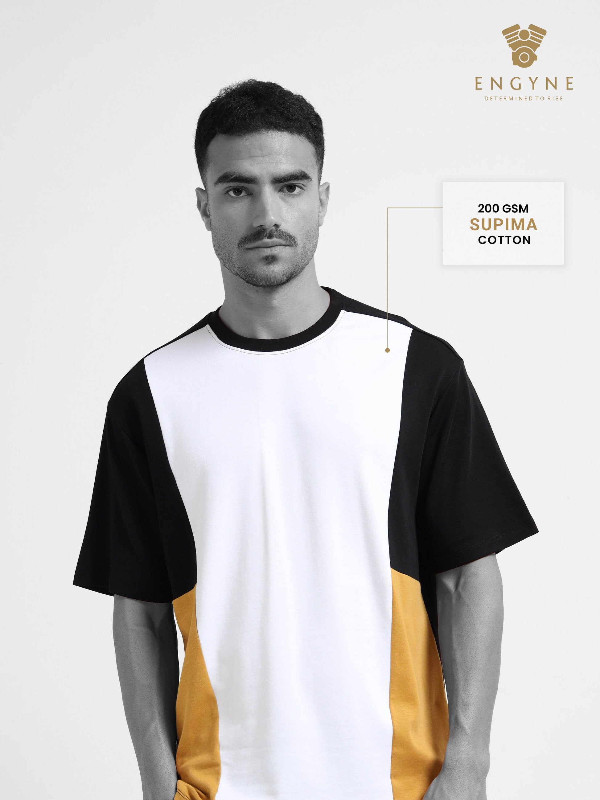 Designed for those who build their own path, this oversize cut & sew tee brings structure and bold detailing together. Made with premium fabric panelling, it features sharp contrast cuts and a high-definition Engyne emblem at the back — a mark of modern ambition.