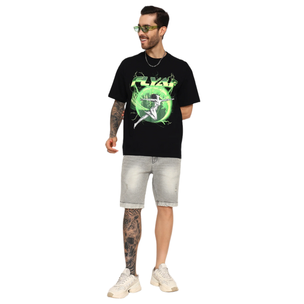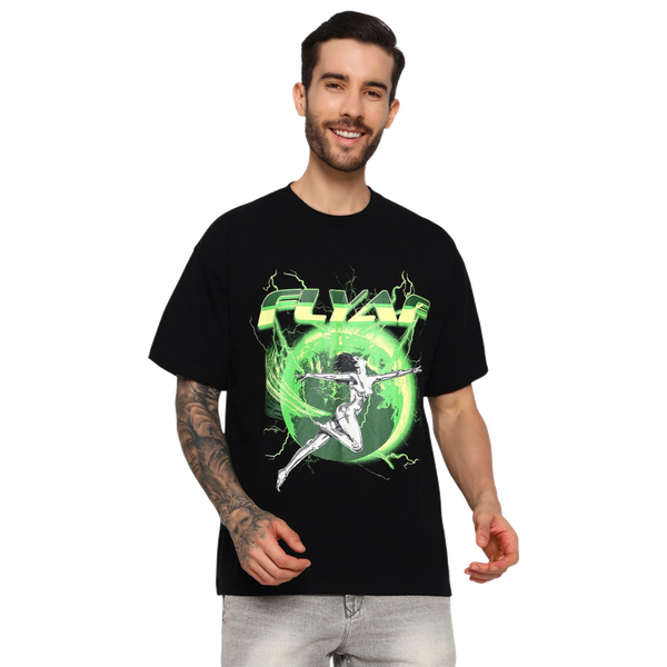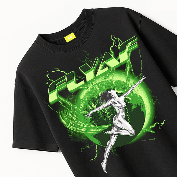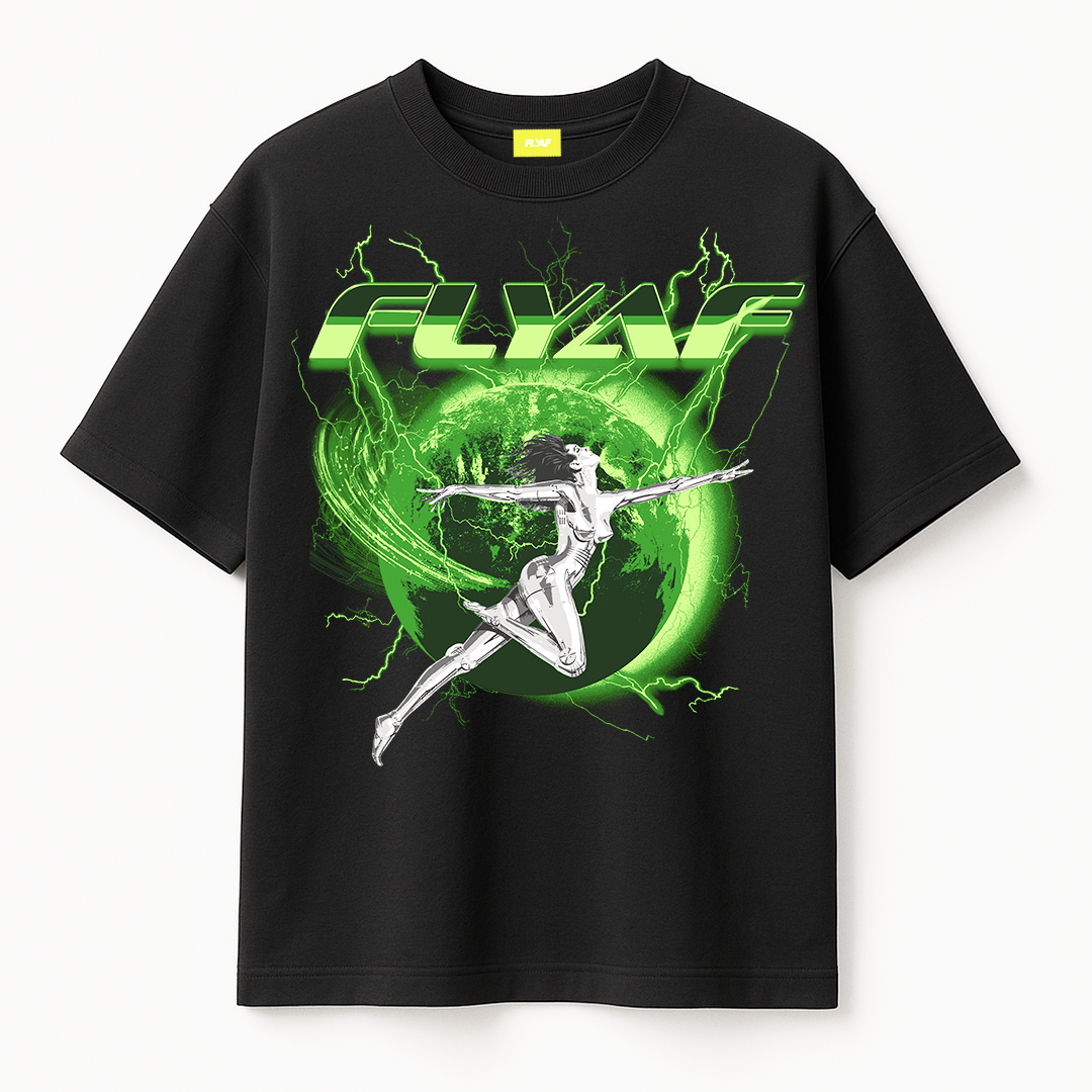 Unleash your futuristic energy with the FLYAF “World Is Your Oyster” Tee. Featuring a high-voltage graphic of a chrome-figure leaping through a glowing green Earth orb, this design is a bold fusion of cyberpunk and streetwear.