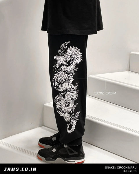 Colour: BlackMaterial: Premium 300 GSM Terry CottonOccasion: Casual, Streetwear, Anime WearPattern: Graphic Snake PrintFit: Relaxed FitNo. of Pockets: Two Side PocketsRise Style: Mid-RiseCare Instructions: Hand & Machine Wash; Do Not Iron on PrintPack Contains: 1 JoggerLength: Full LengthCountry Of Origin: India