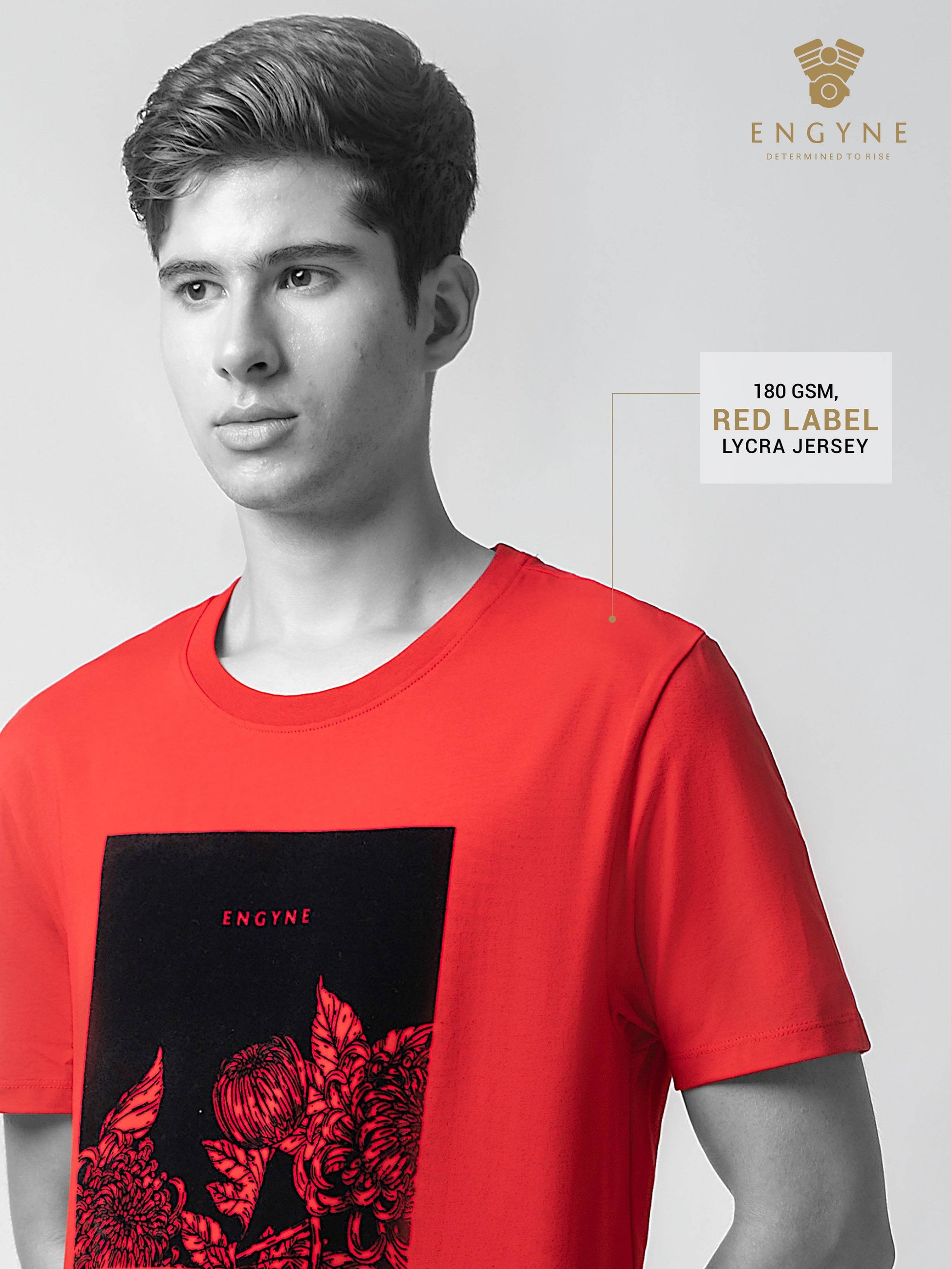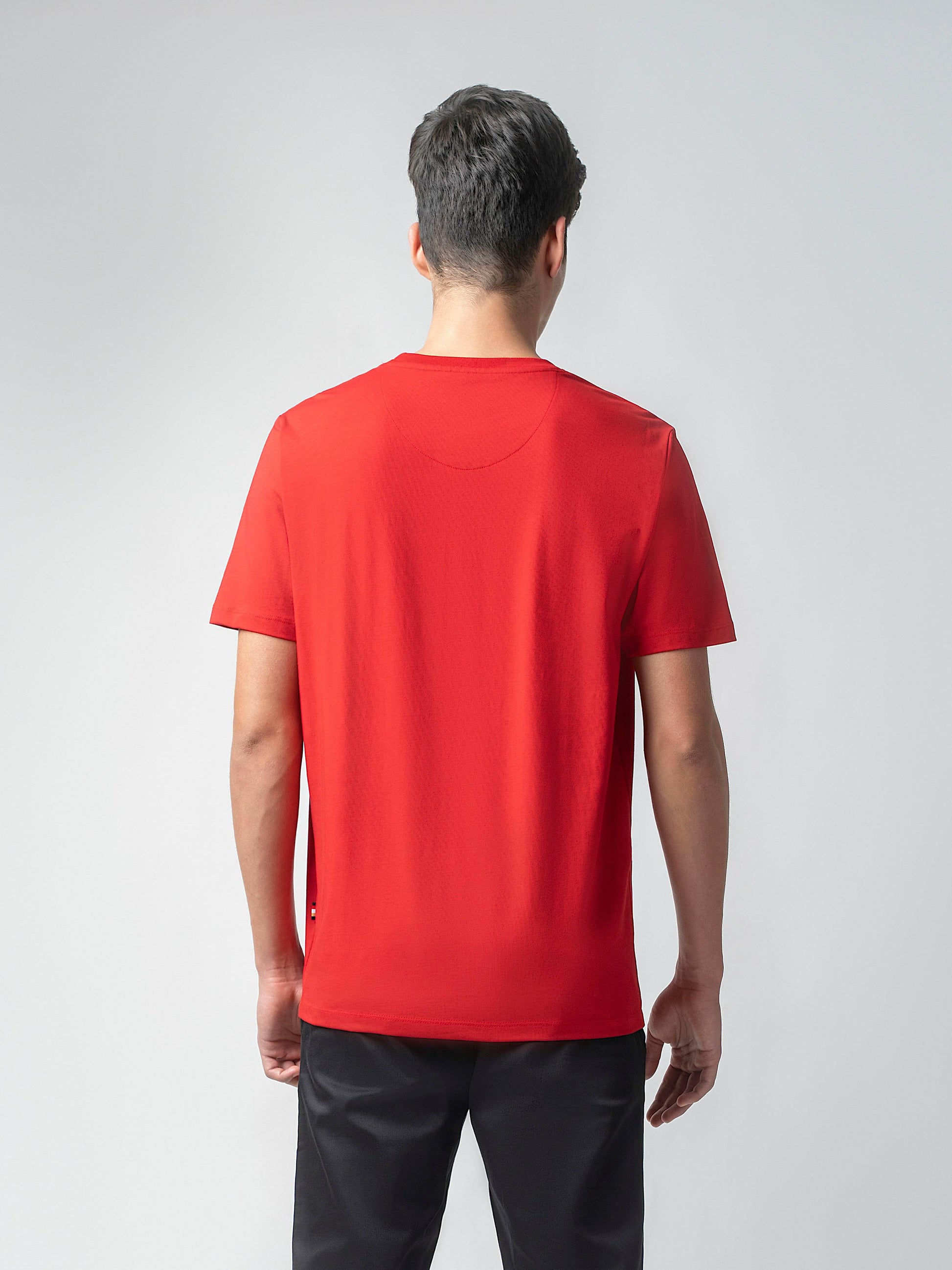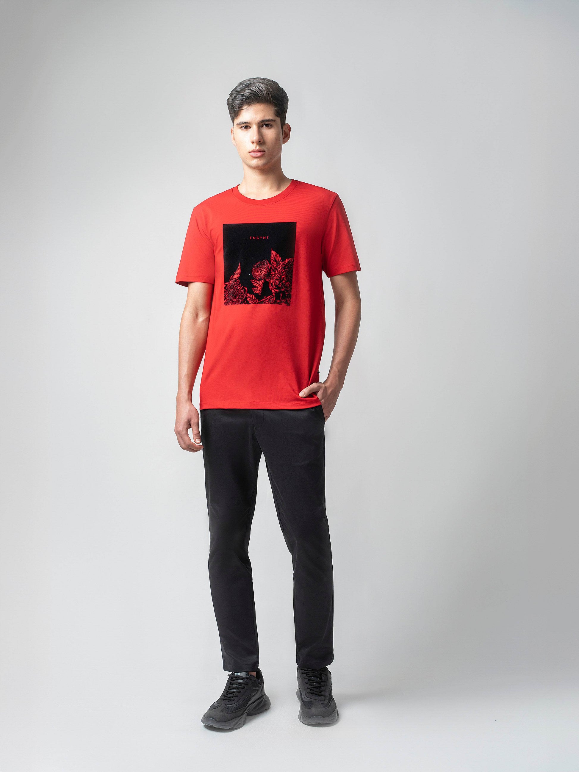 Rougen Cotton Lycra with Flock Print at Chest Red T-shirt