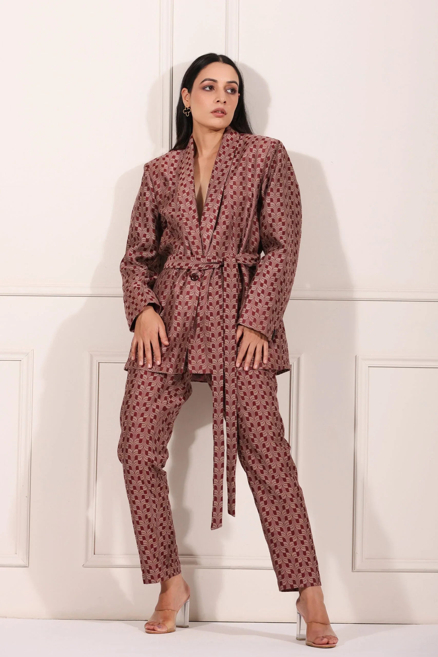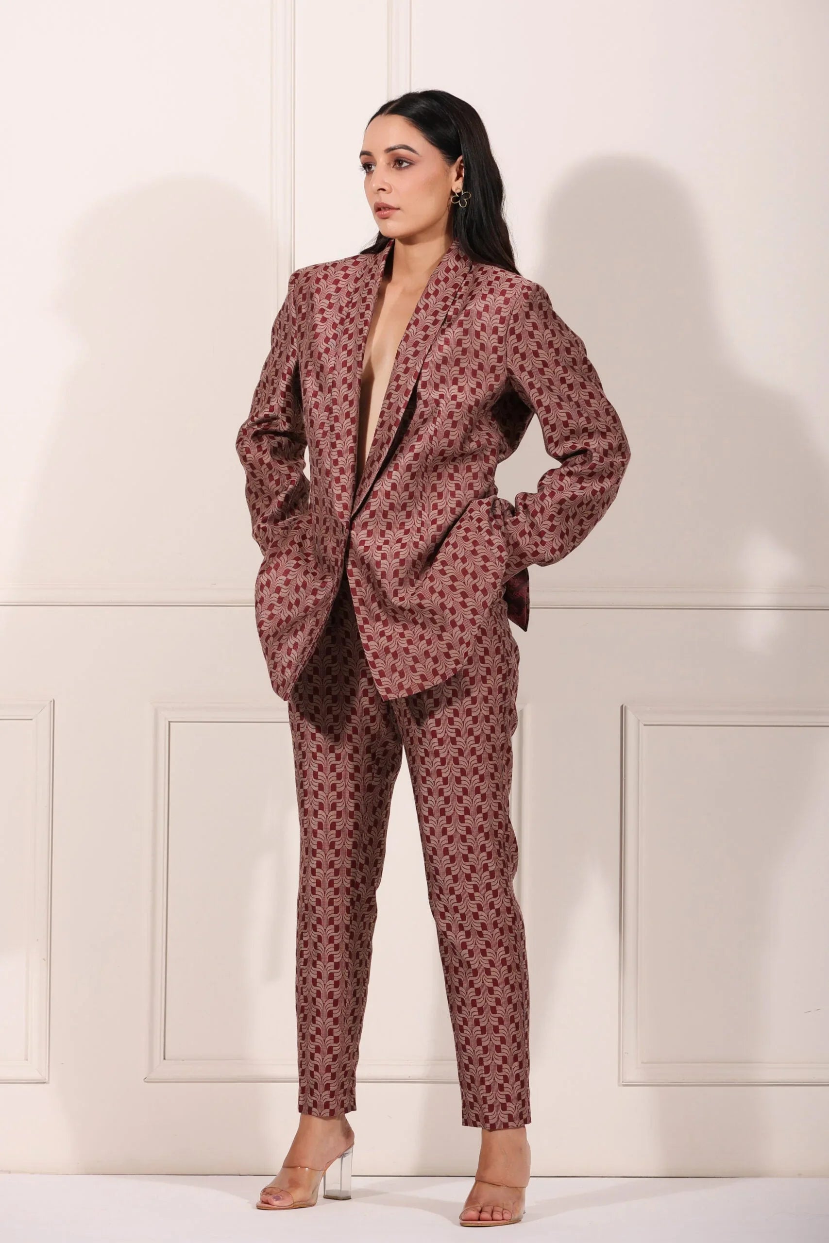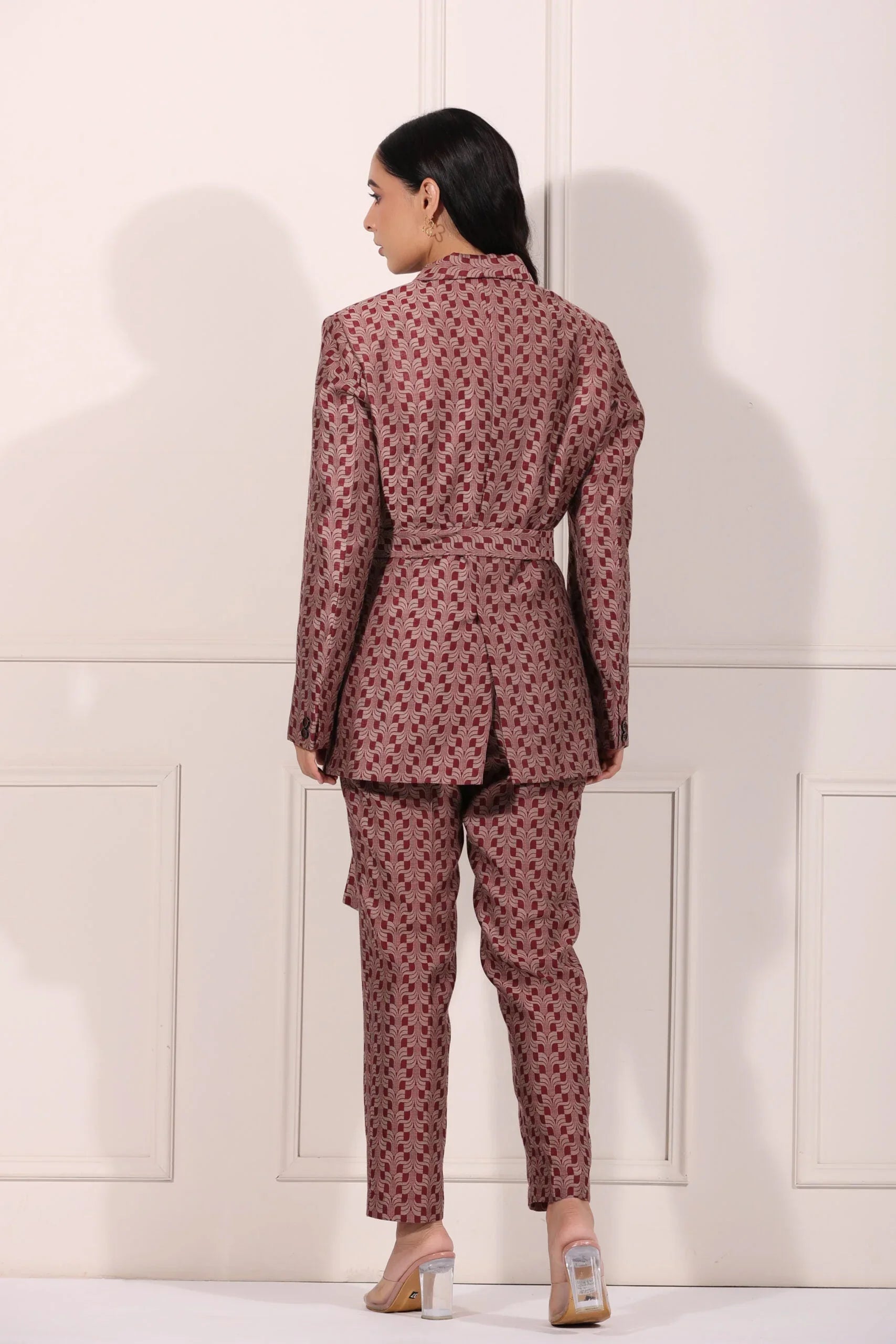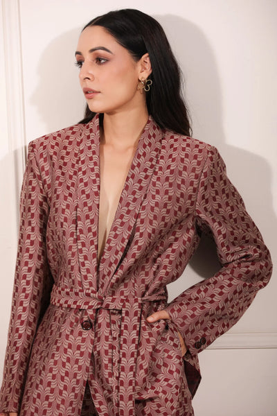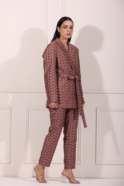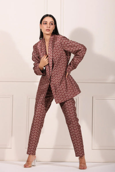 What makes this co-ord set unique is its versatility. Wear it together for a polished look, or mix and match the blazer or pants with other pieces in your wardrobe. The rich color palette and modern aesthetic make it a timeless addition to your fashion lineup.