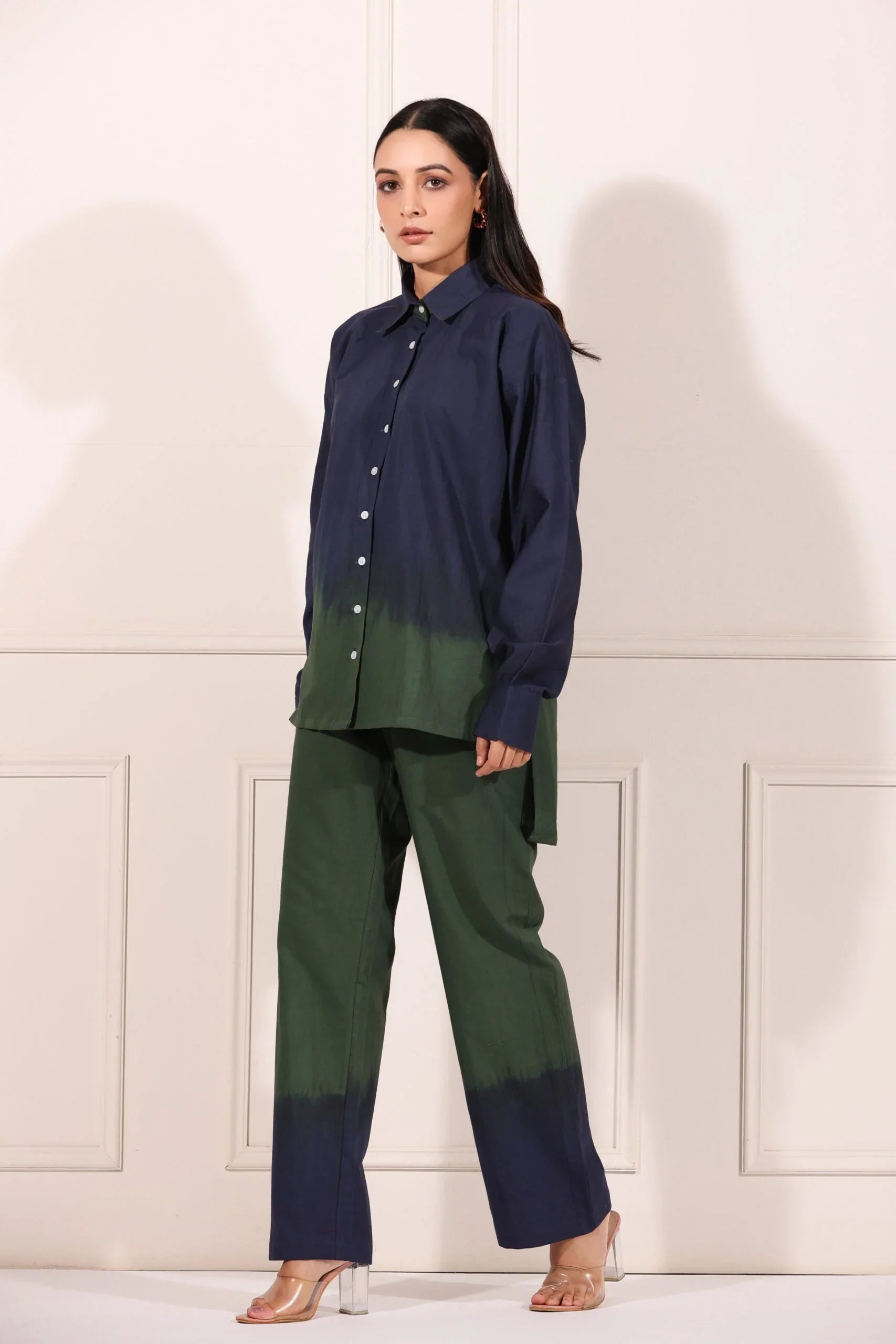 Elevate your wardrobe with the Mitali Ombré Co-ord Set, available at Stylera. This exquisite navy green two piece matching set features a beautifully designed shirt and pant combination, ideal for any occasion. The unique ombré effect seamlessly blends deep navy hues with a vibrant green, offering a fresh take on contemporary fashion.