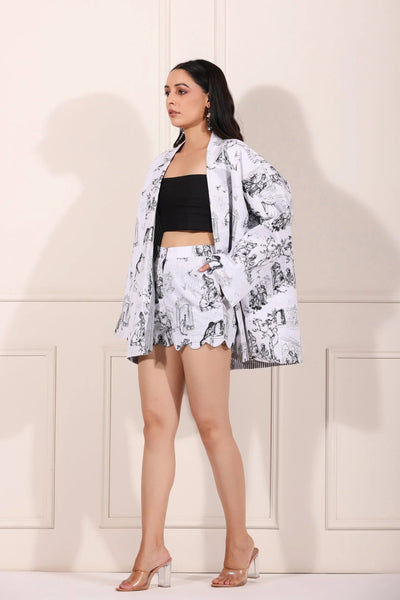 Elevate your wardrobe with the women's printed blazer shorts set from Stylera. This stylish co-ord set features a unique design that captures the essence of Jaipur's vibrant culture, making it perfect for a chic summer outing or a casual day out with friends.