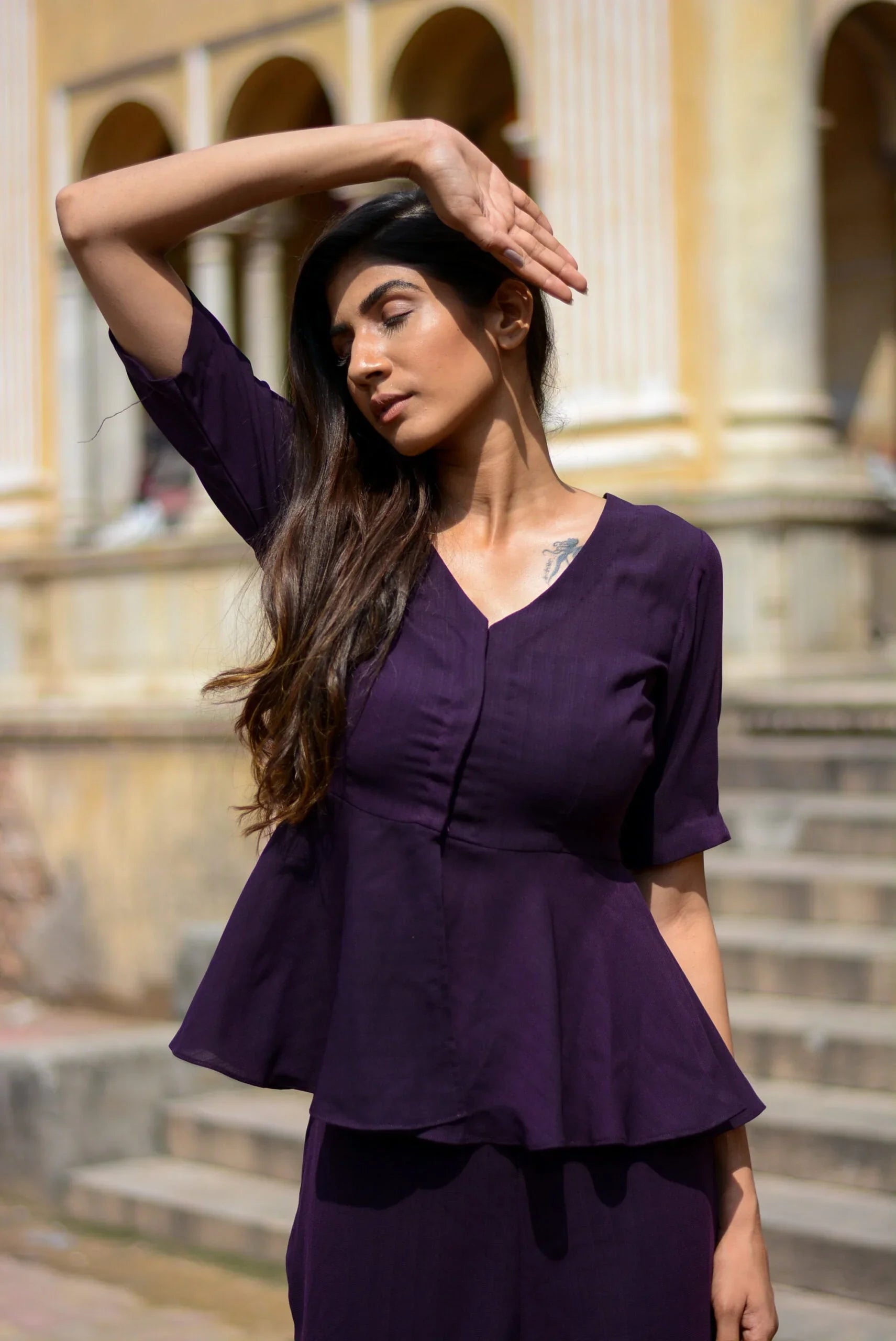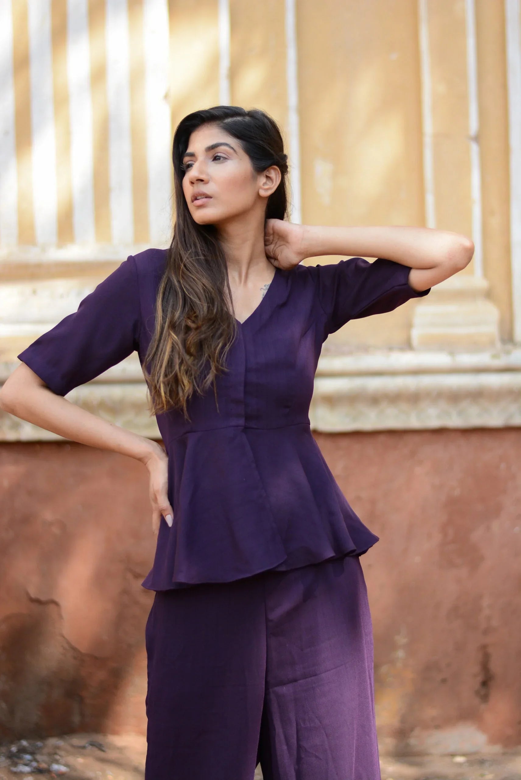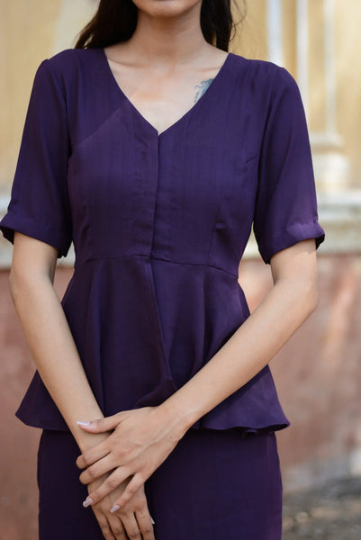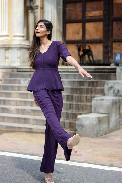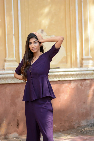 Discover the elegance of the eggplant co-ord set from Stylera, available at Stylera. This gorgeous set features a stylish peplum top and matching trousers, crafted from high-quality fabric. The rich eggplant color adds a touch of sophistication, making it perfect for various occasions, from brunches to evening outings.
