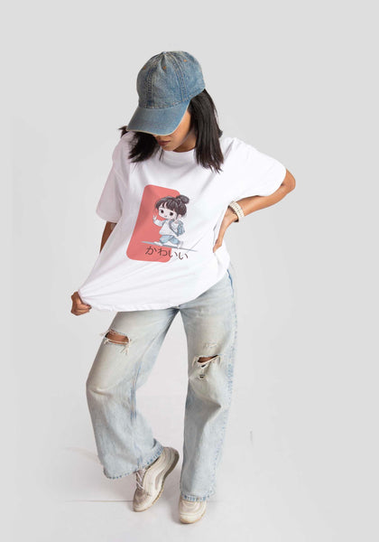 Step into casual comfort with the KAWAII: WHITE OVERSIZED FIT from Stylera. This white oversized anime t-shirt for women is ideal for anyone who loves playful and expressive fashion. The relaxed fit pairs well with jeans, joggers, or skirts. It gives you flexibility for any casual outing.