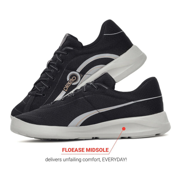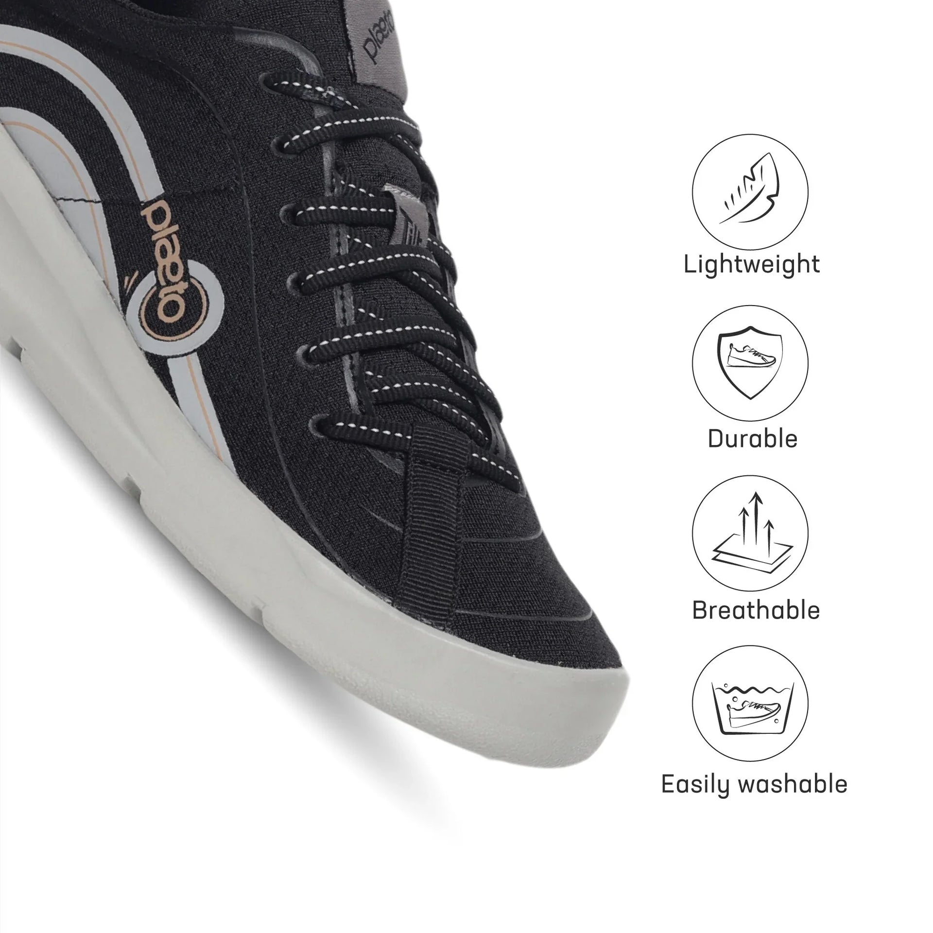 Colour: BlackMaterial: Engineered mesh with synthetic overlays for breathability and durabilityClosure: Lace-upToe Shape: Round toeAnkle Height: Low-topOccasion: Casual wear, walking, workouts, gym sessions, daily active useCare Instructions: Wipe clean with a damp cloth; air dry; avoid machine washPack Contains: 1 pair of Plaeto Go Sports ShoesCountry Of origin: India