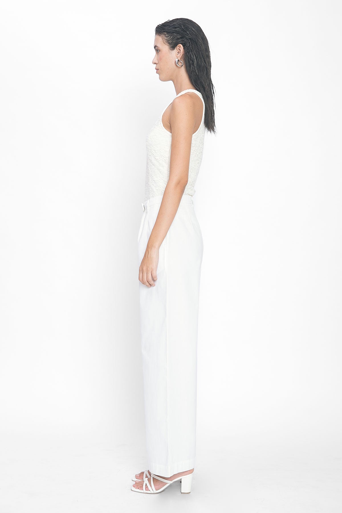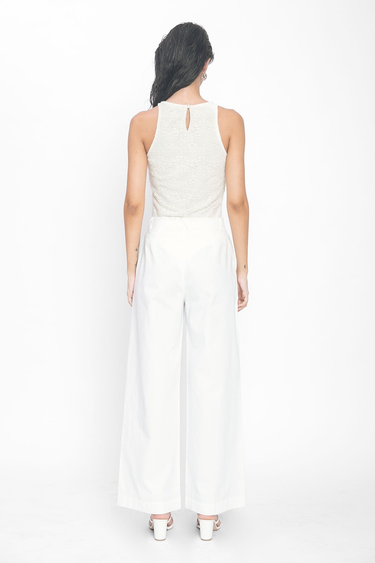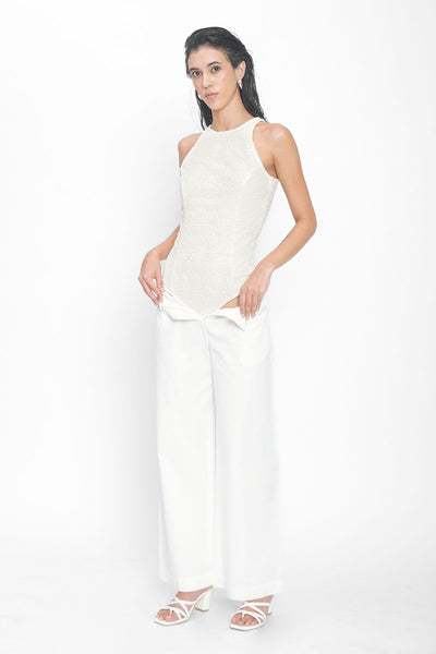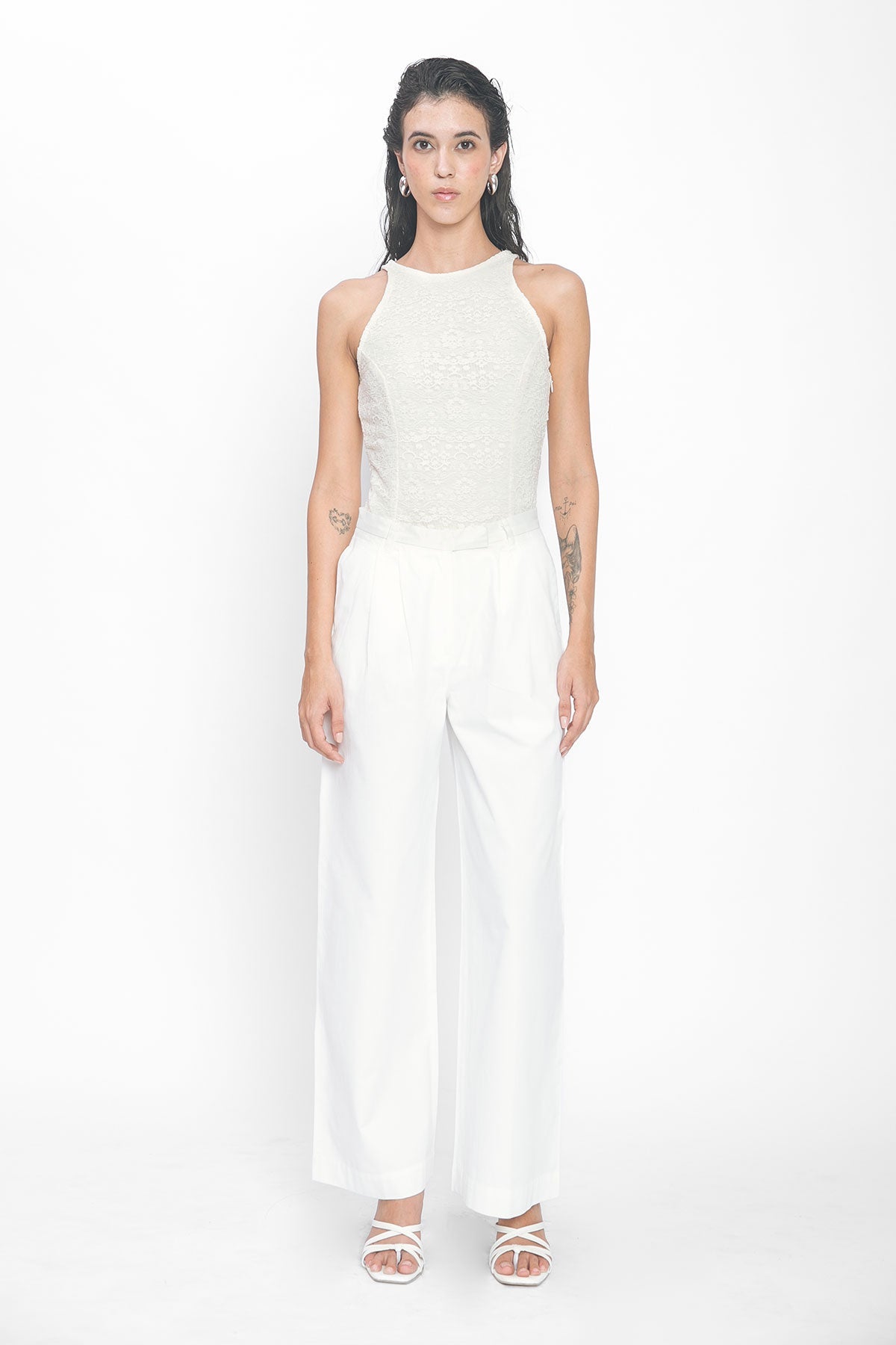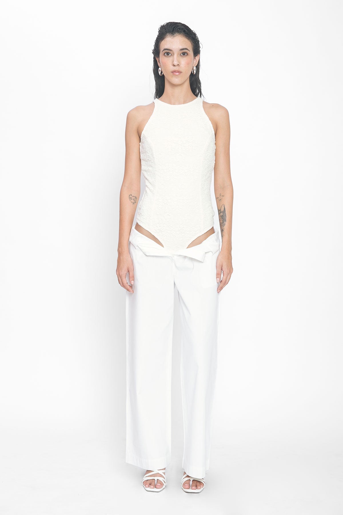 A sleeveless bodysuit with a high round neckline, crafted in allover Schiffli embroidery. Finished with a concealed side zipper for a seamless fit.