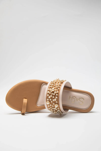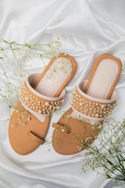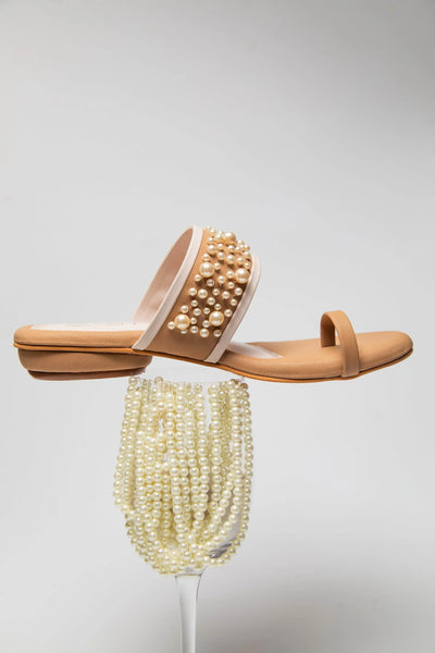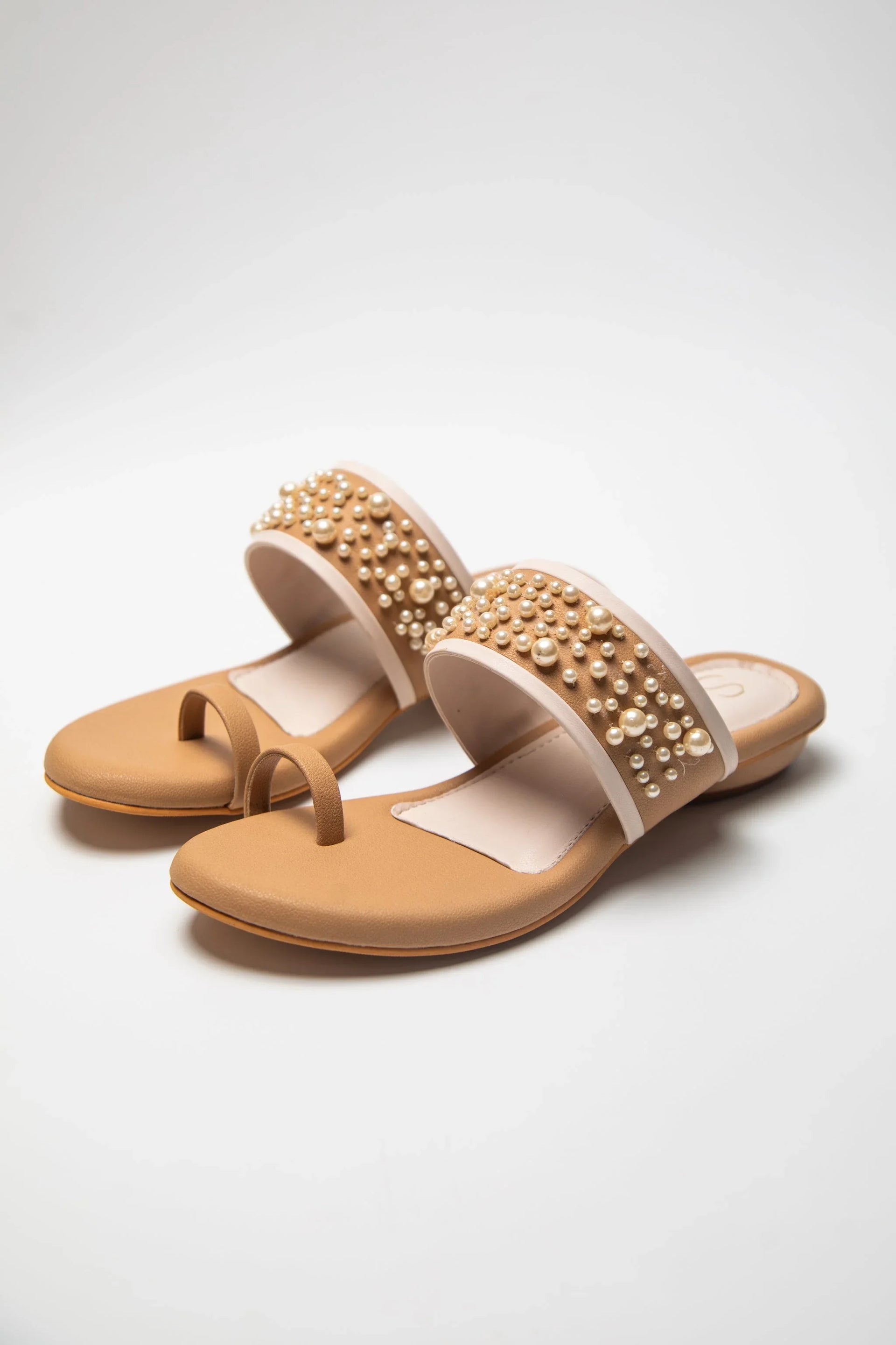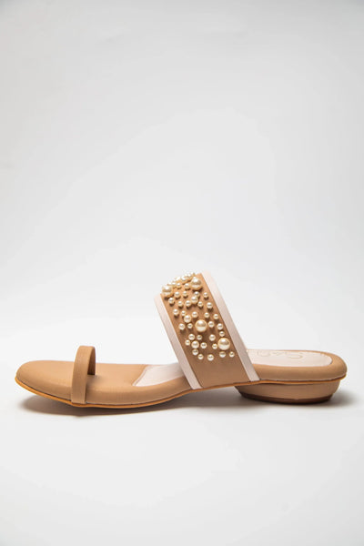 Elevate your style with our Kolhapuri-inspired footwear, featuring a classic brown and beige design adorned with elegant pearl embellishments. Crafted for comfort with a cushioned footbed and flat heels, these sandals offer both traditional charm and modern comfort. Perfect for adding a touch of sophistication to any outfit.