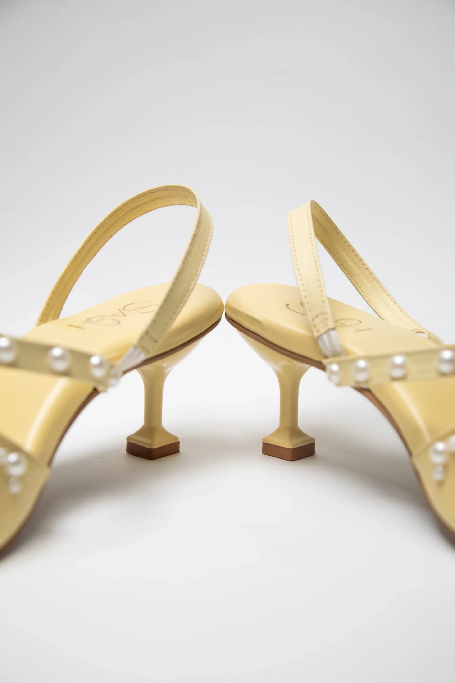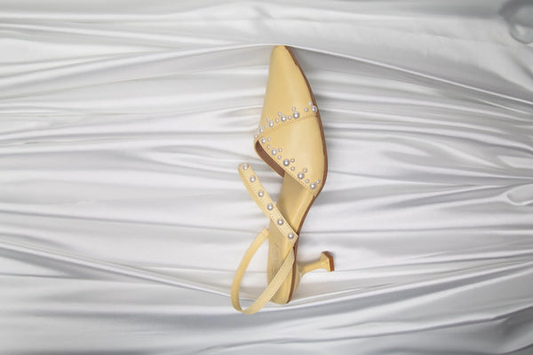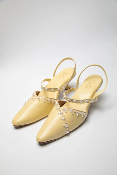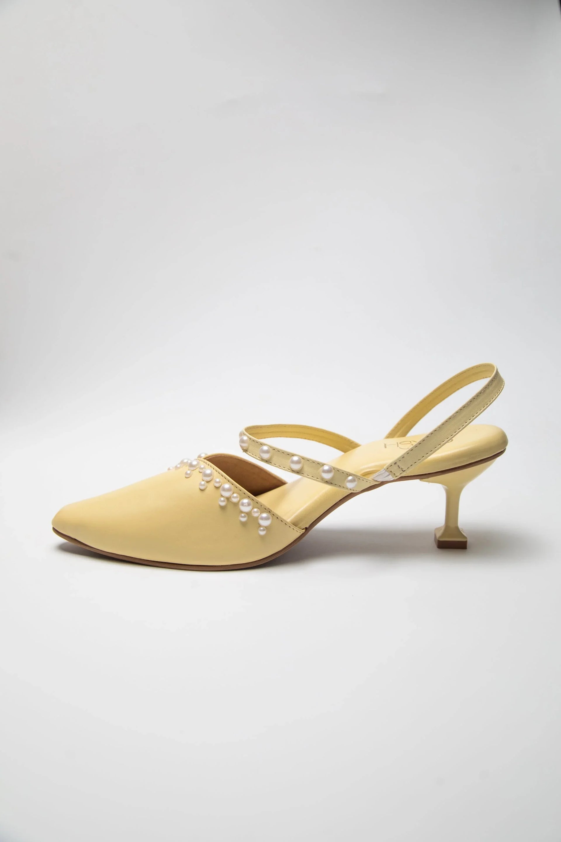 Step into refined elegance with our Honeyed Heels—cushioned closed-pointy sandals featuring 2-inch kitten heels. In a charming butter yellow and brown, these sandals are adorned with intricate pearl work and designed with ankle support for added comfort and style. Perfect for a touch of sophistication in every step.