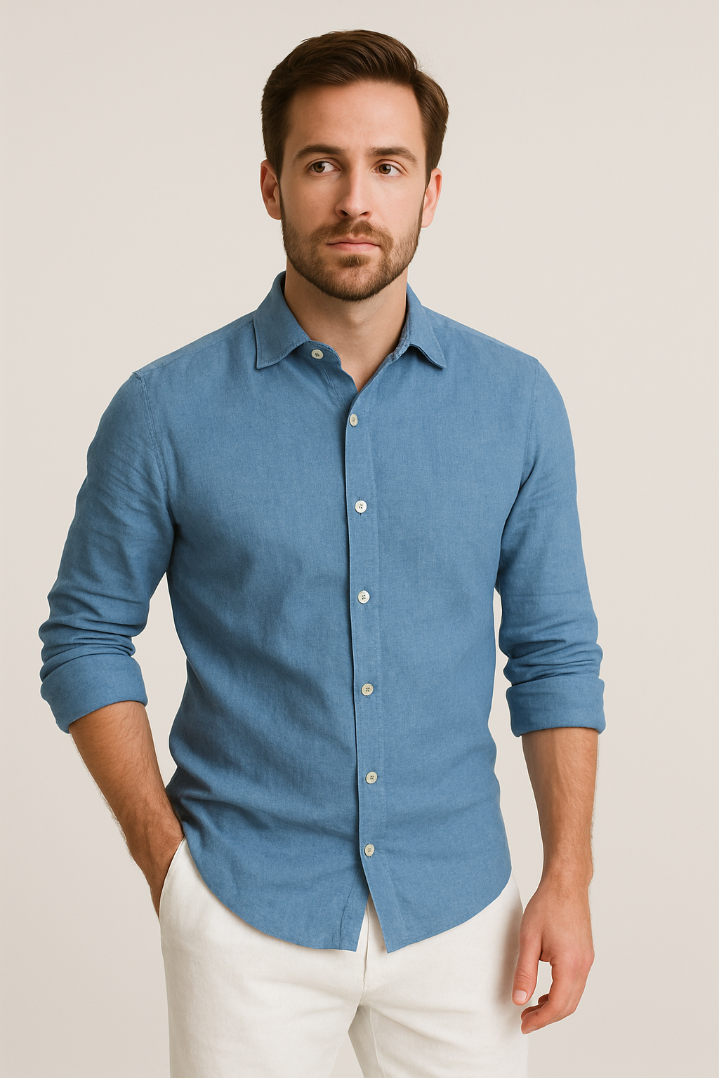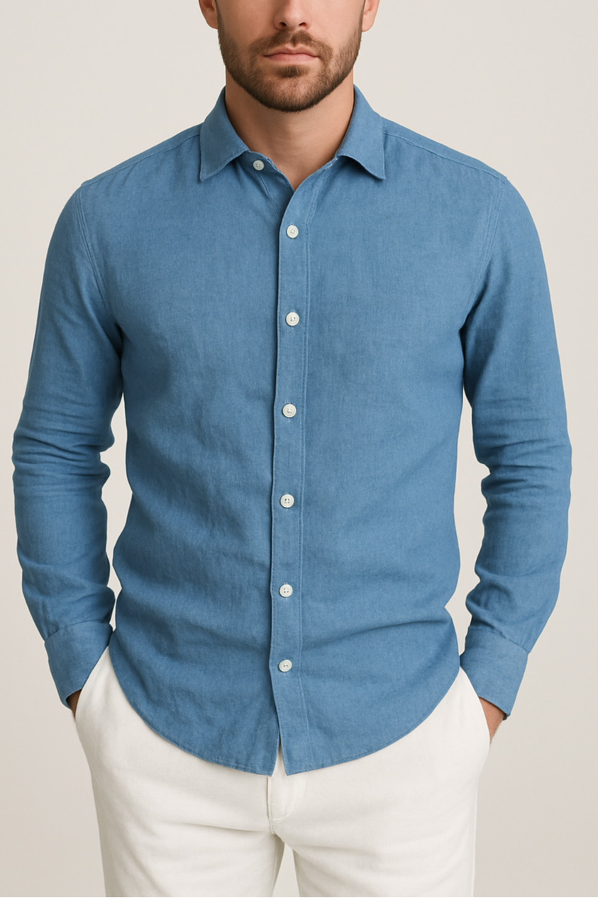 The long-sleeve soft Azure Blue shirt is designed from a lightweight, breathable linen fabric enzyme washed for extra softness — perfect for any semi-formal occasion.