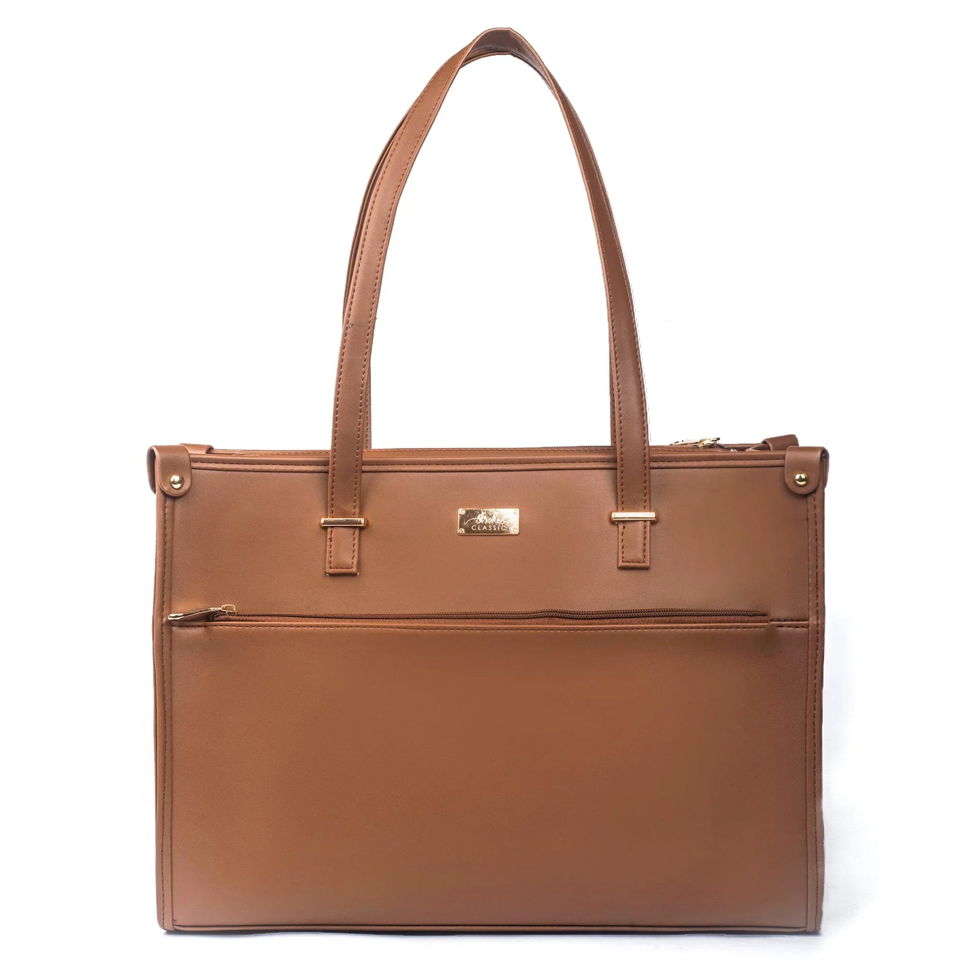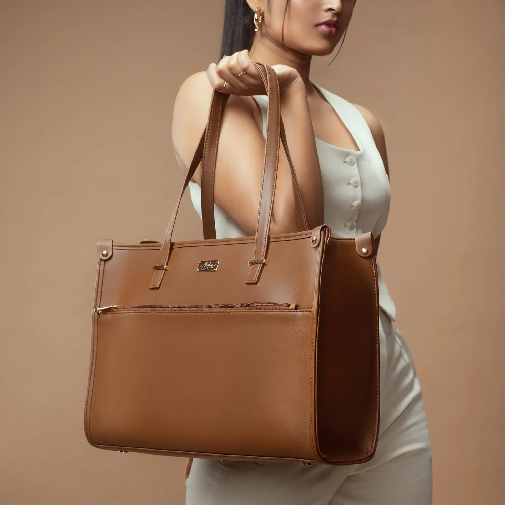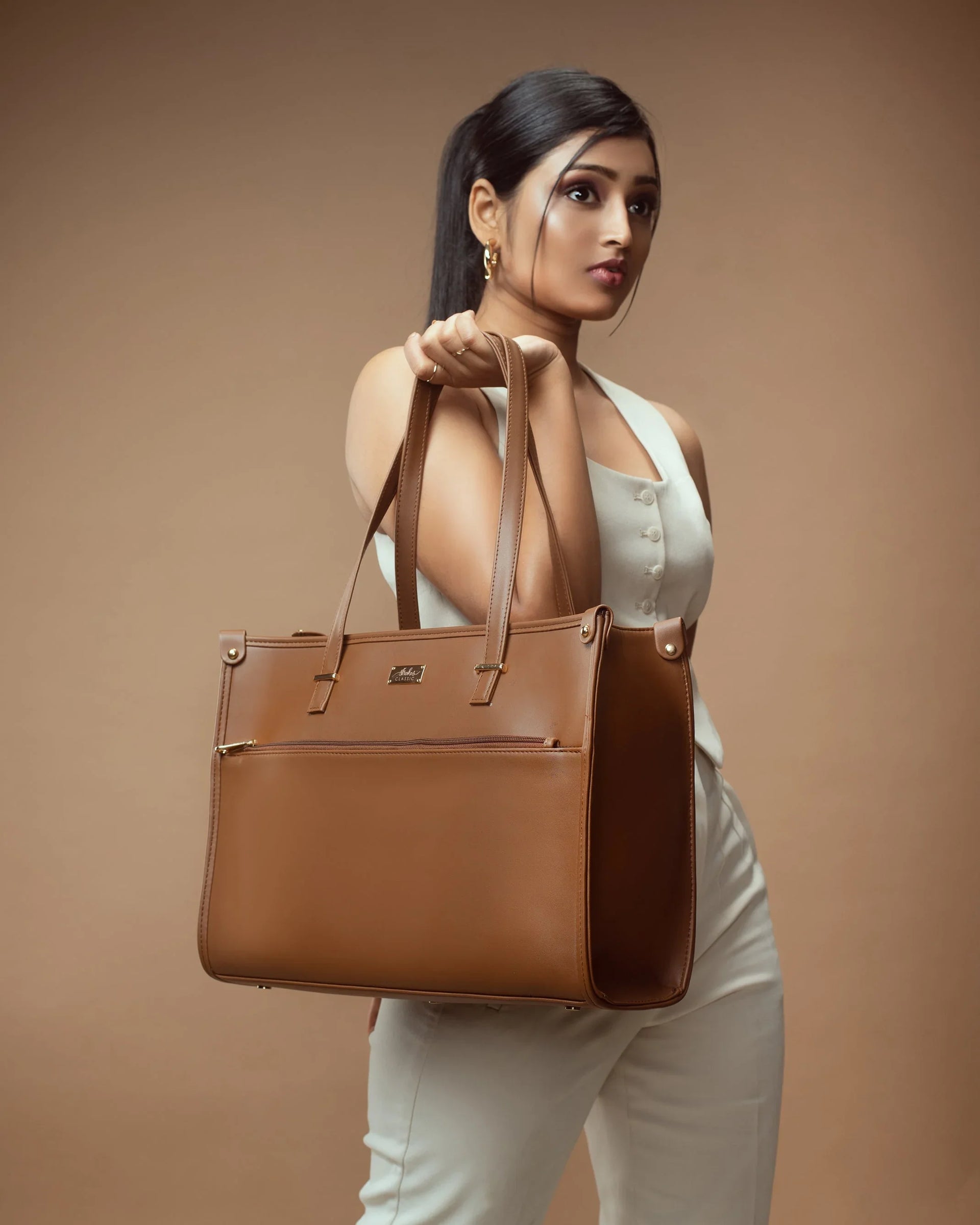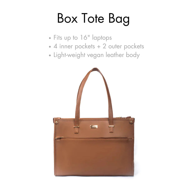 The Mocha Elegance Box Tote bag flaunts a rich shade of chocolate brown in premium vegan leather, making it perfect for any look or outfit. This stylish bag is spacious with a laptop compartment and multiple pockets making it a perfect companion for your day to day routine, work or an outing!