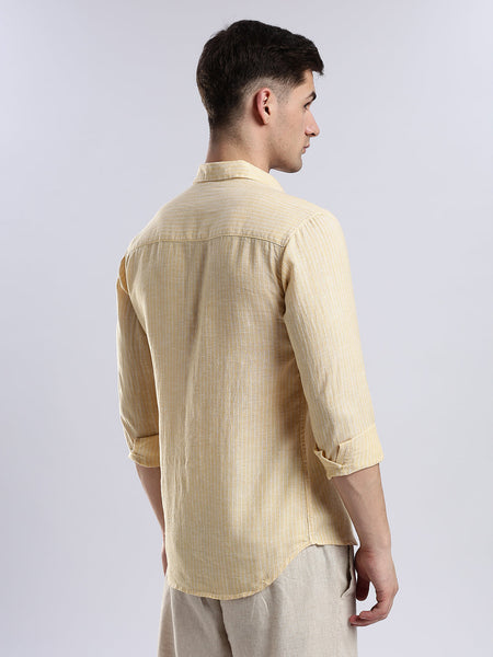A refined pastel essential crafted in 100% European linen with a subtle yarn-dyed pinstripe, the French Soleil Pinstripe Shirt captures effortless sophistication in a calm, coastal hue. Woven from 60s lea long-staple linen and silicon-washed for exceptional softness, it offers a breathable, feather-light feel with a naturally elegant drape.