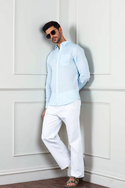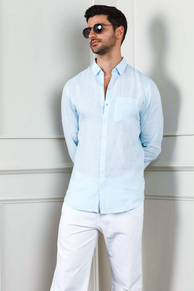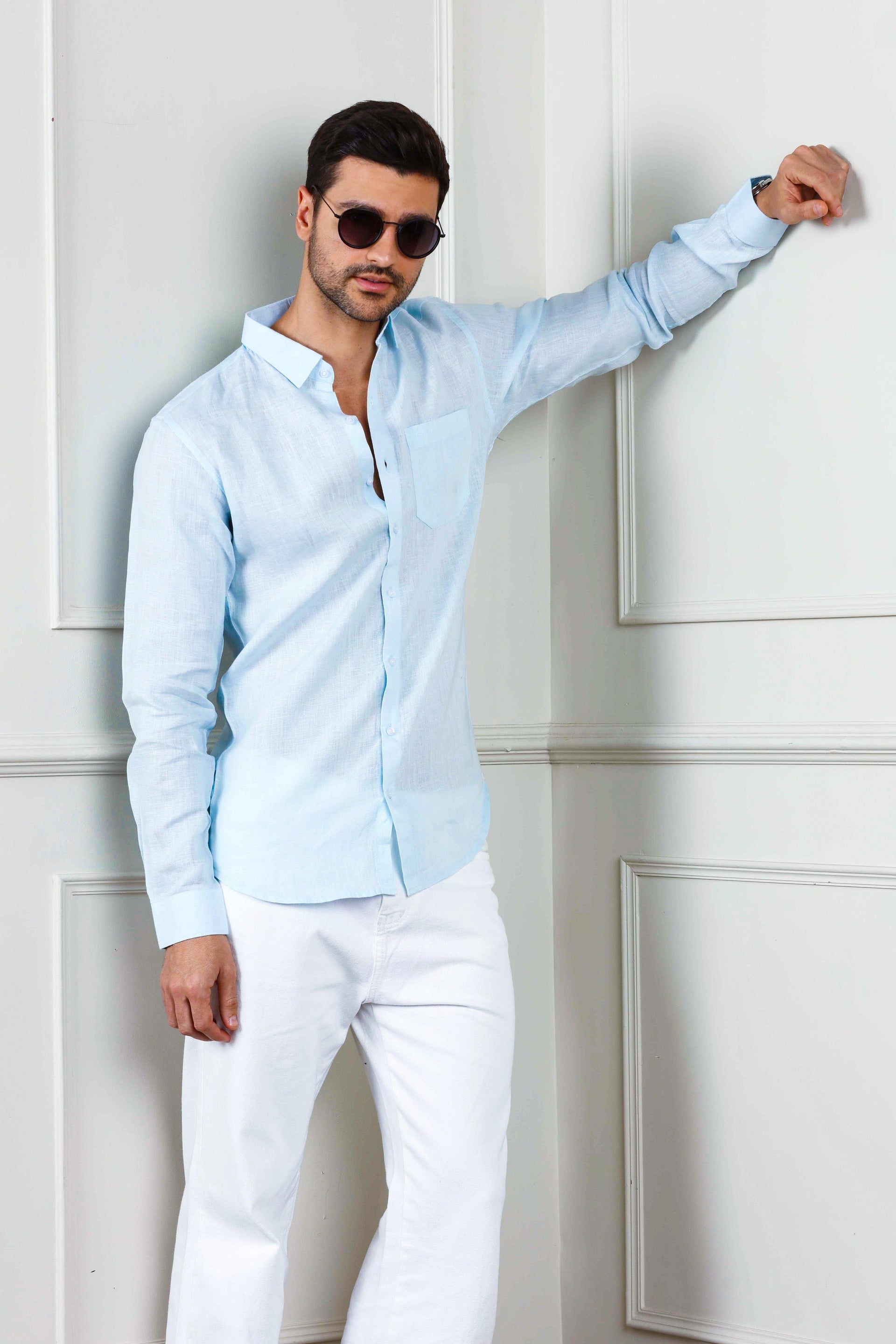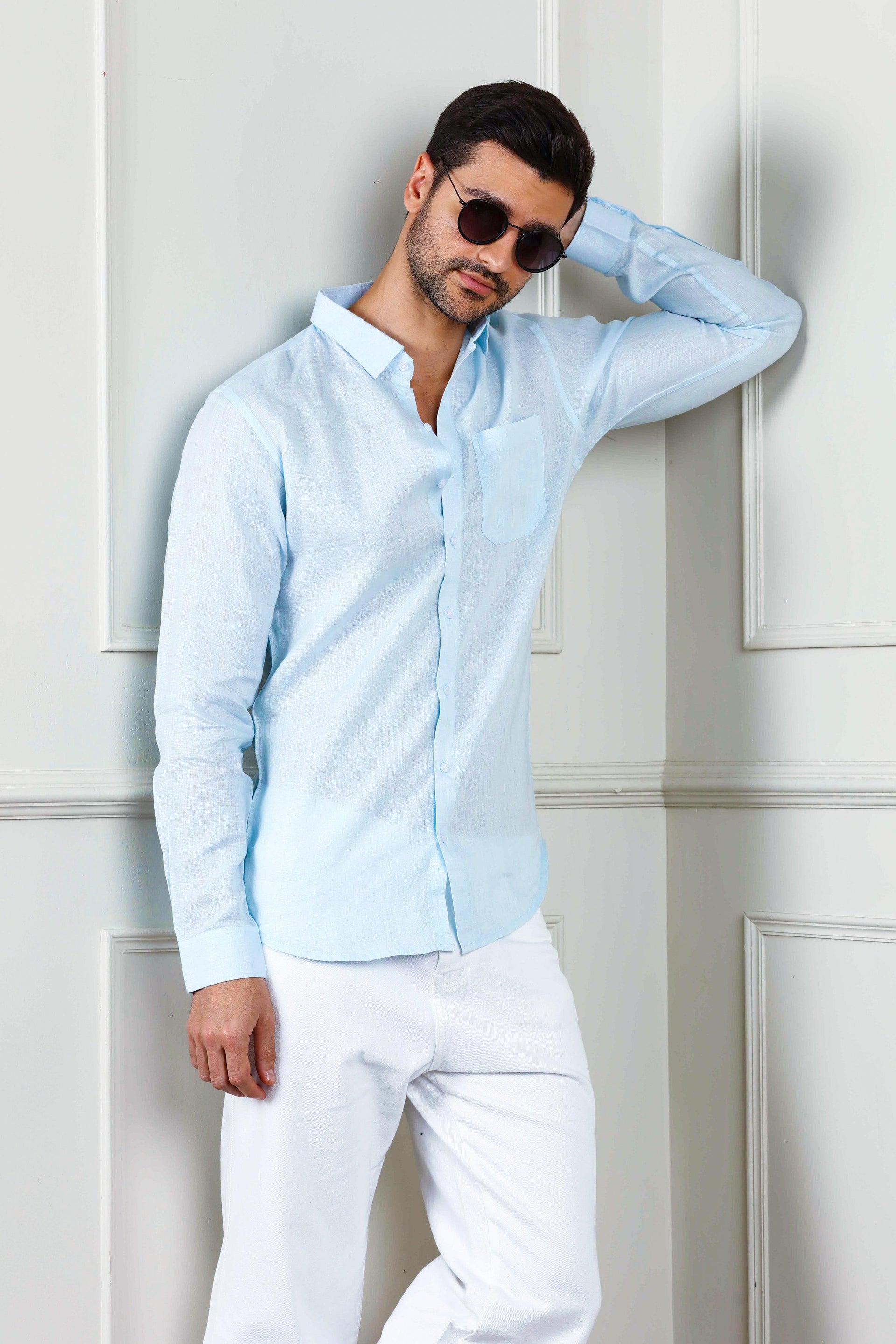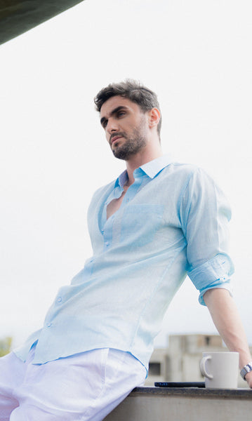 The long-sleeve soft Baby Blue shirt is designed from a lightweight, breathable linen fabric, enzyme washed for extra softness — perfect for any semi-formal occasion.