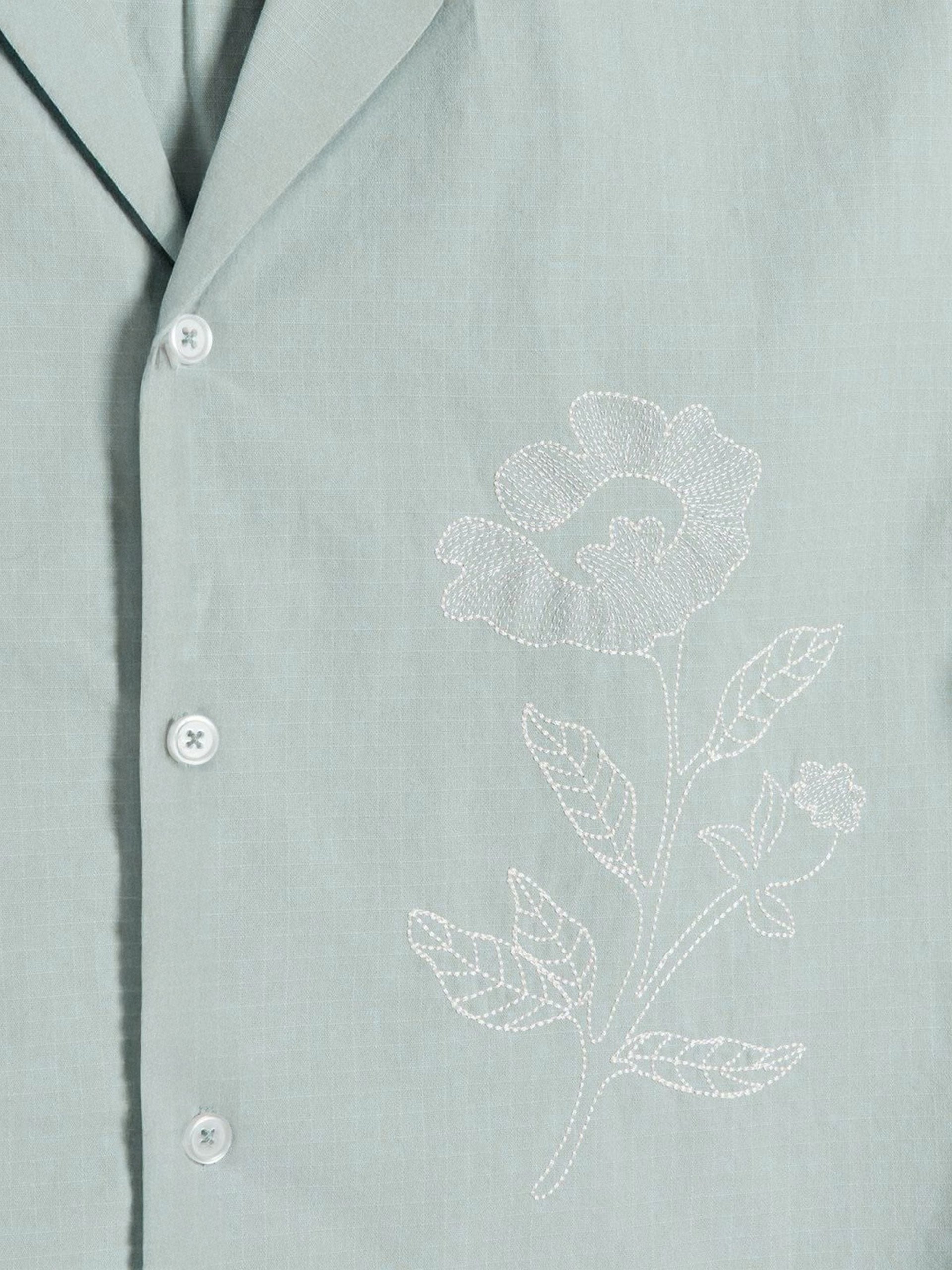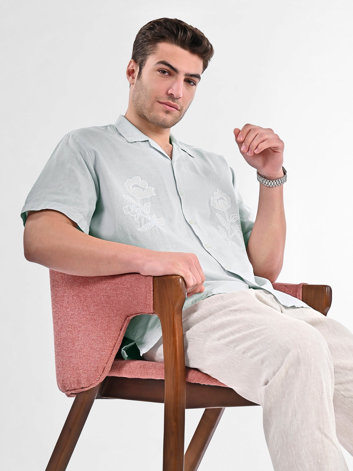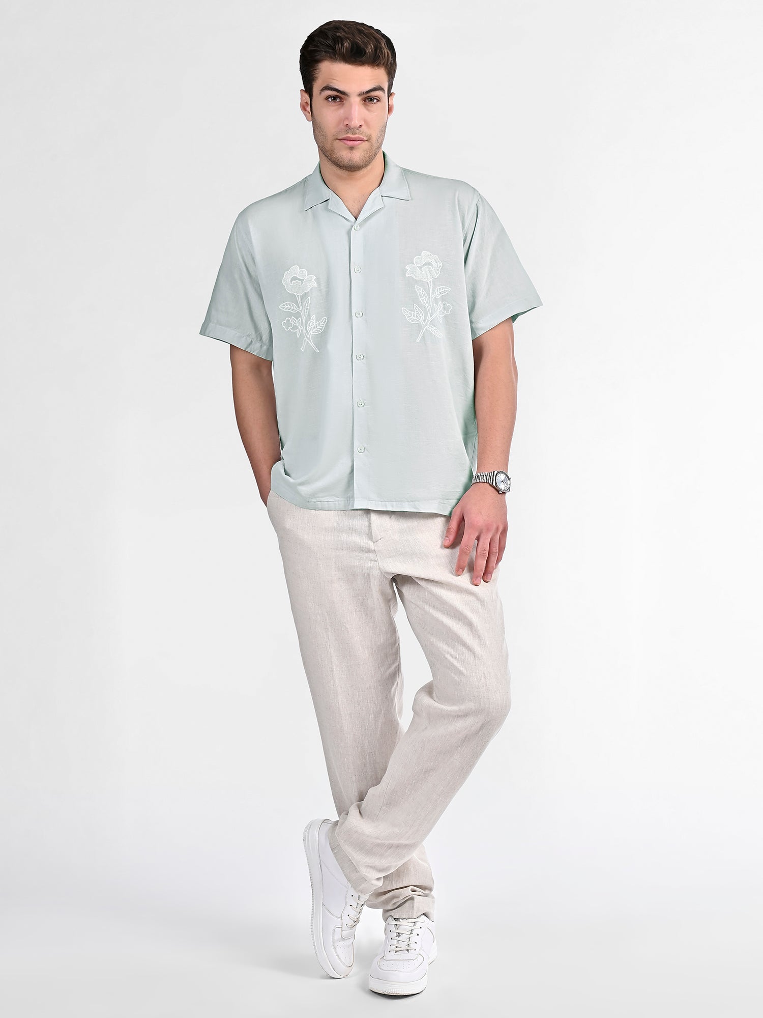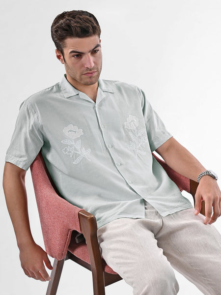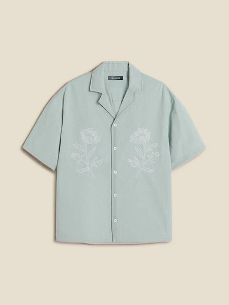 Breathe effortless elegance into your wardrobe with the Botanic Bloom Box-Fit Linen Shirt. Crafted from a lightweight cotton-linen blend, this shirt offers a relaxed boxy fit for all-day comfort. The delicate floral embroidery on the front adds a refined yet minimalistic charm, making it perfect for both casual outings and elevated summer looks. Featuring a Cuban collar and tonal buttons, this piece blends sophistication with a laid-back appeal.