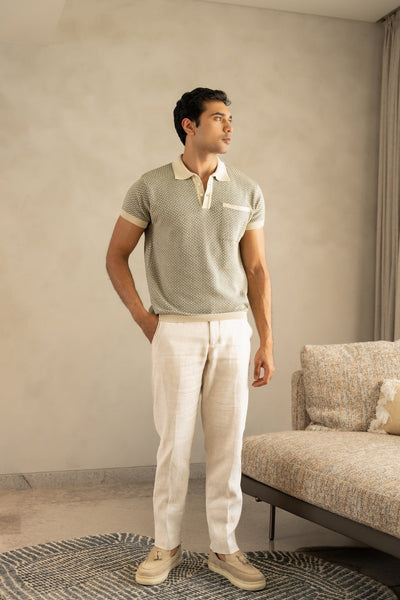 Introducing the Jacquard Knit Polo in Ivory Matrix — a timeless expression of quiet luxury and refined craftsmanship. Made from 100% combed compact cotton with long fibers, this polo offers superior softness, breathability, and a polished finish.