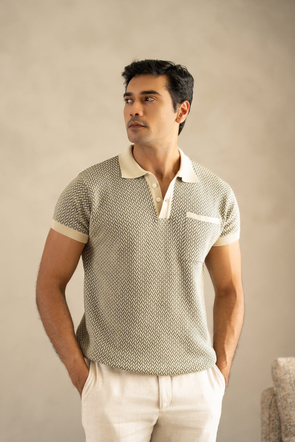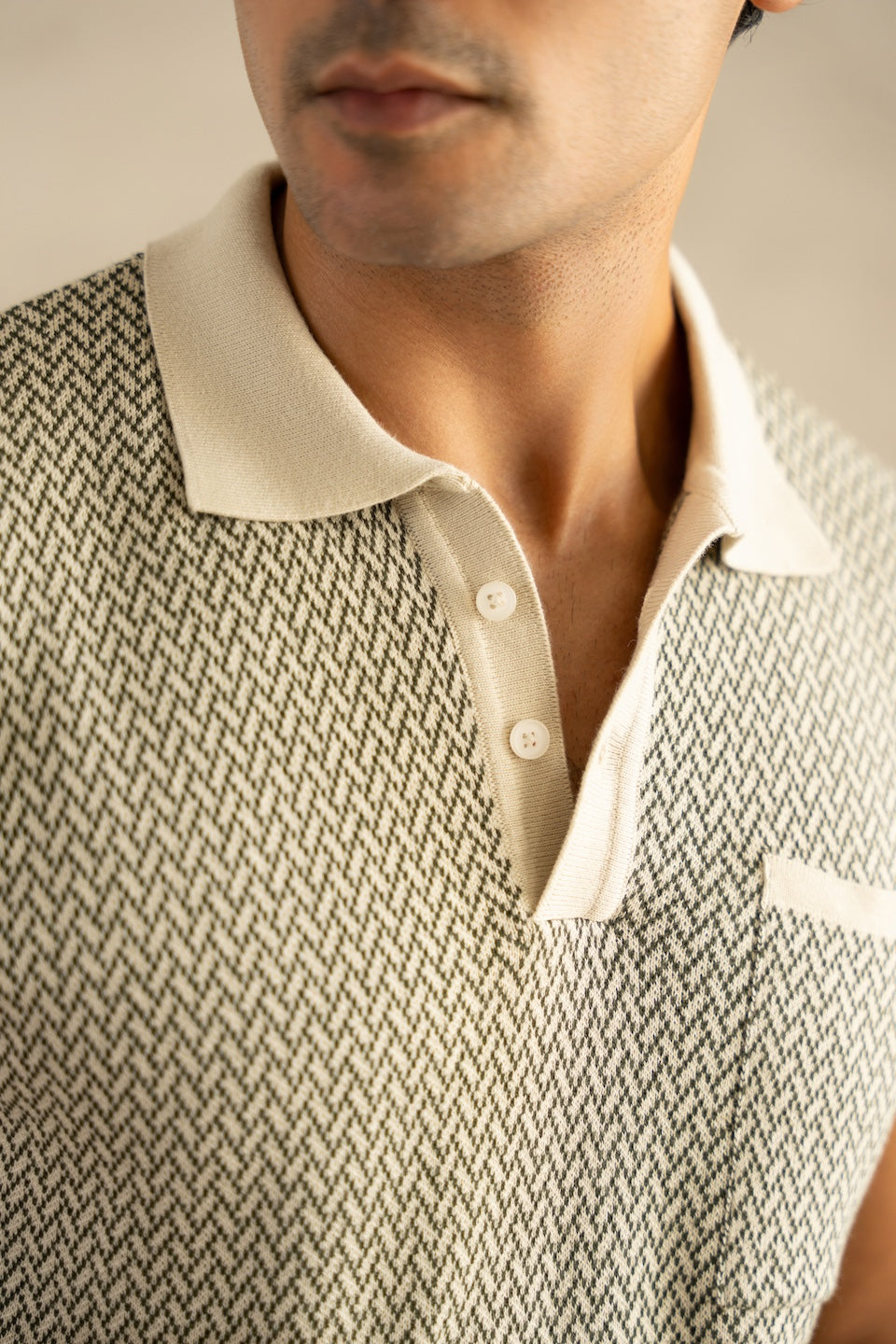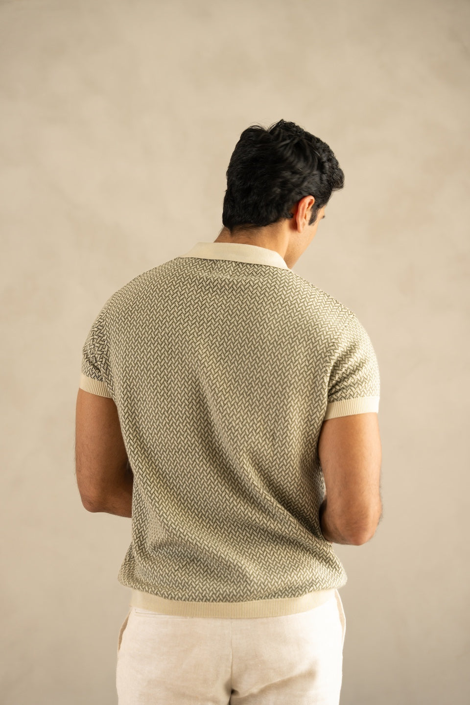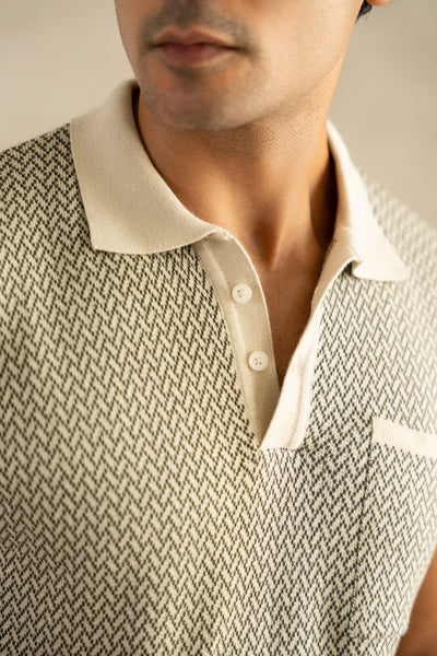 Knitted on a fine jacquard flat-knit machine, the intricate ivory and beige pattern delivers rich texture and visual depth. The classic polo collar adds structure, making it a versatile essential for elevated everyday wear.