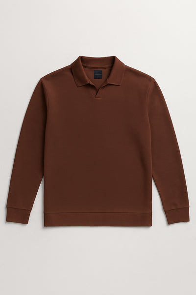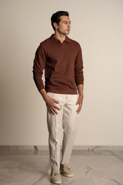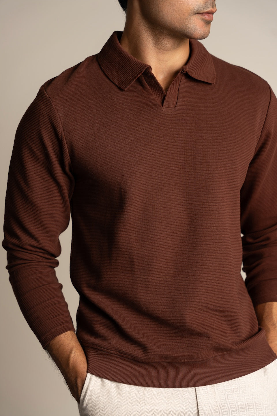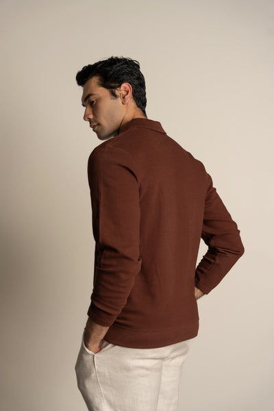 Introducing our Ottoman Rib Johnny Collar Polo with full sleeves in Deep Brown color, crafted from luxurious 100% long staple cotton. Elevate your wardrobe with this sophisticated piece, meticulously knitted with ottoman rib detailing for added texture and style.