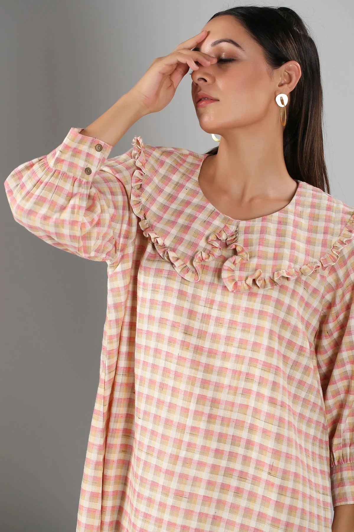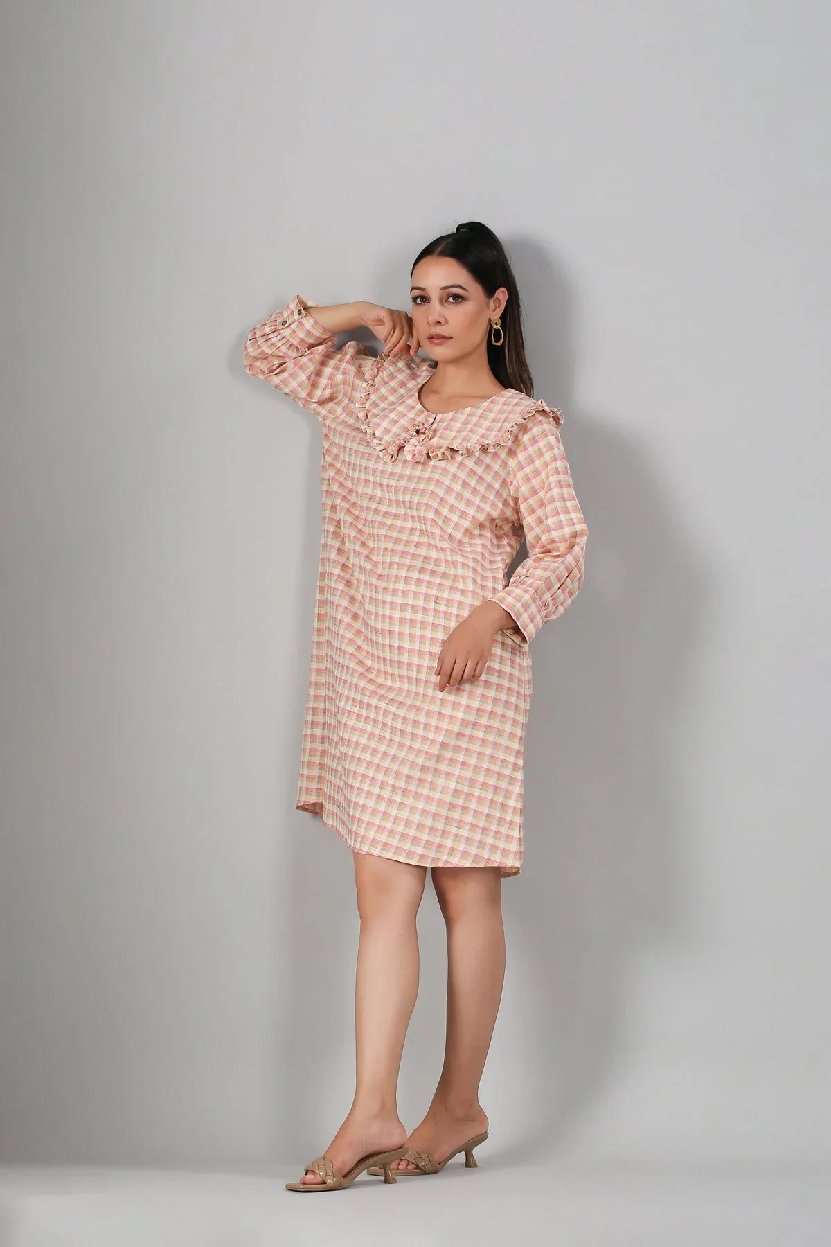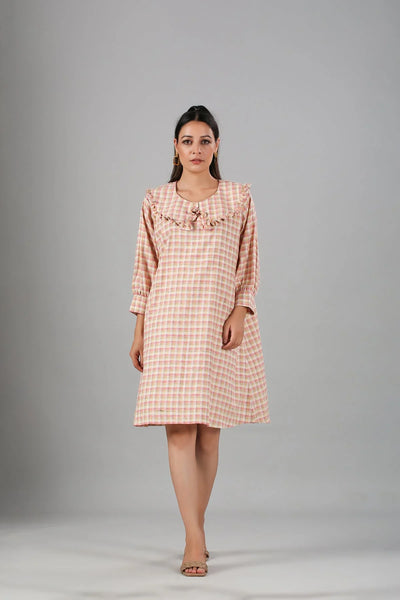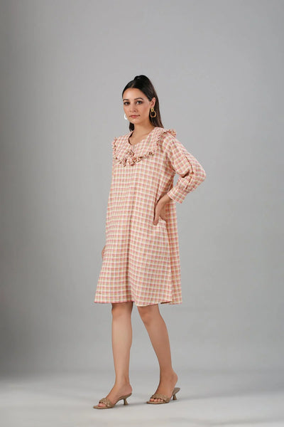 Featuring a relaxed fit, the Gingham Short Dress is designed to flatter all body types. The gentle ruffles around the neckline provide a feminine touch without compromising comfort. Pair it with sandals for a day at the park or dress it up with heels for an evening out. This casual checkered dress for women is versatile enough for any occasion.