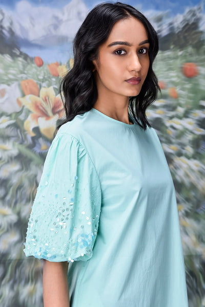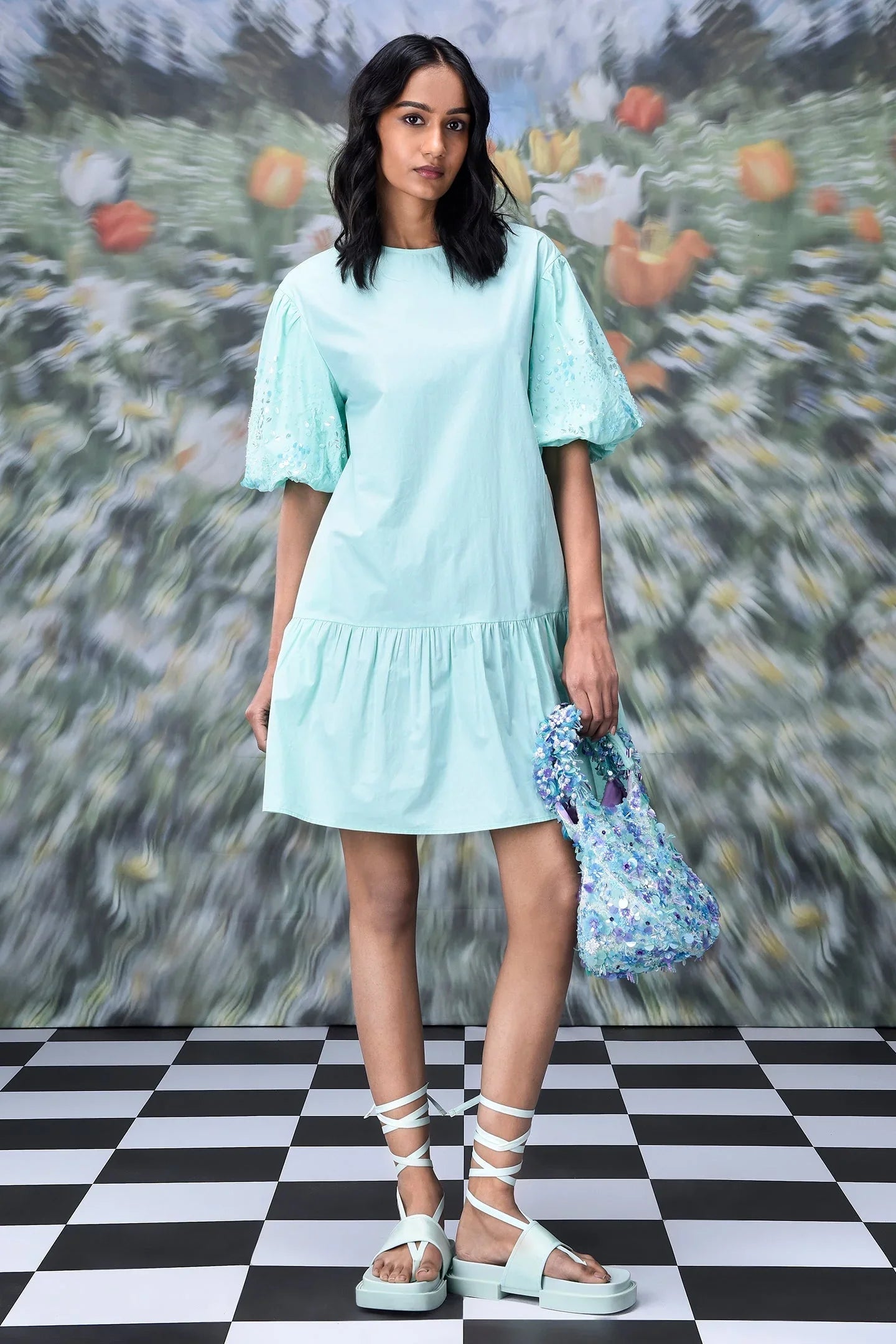 Step into the spotlight with the Sequinscape A-Line Dress from Stylera. This piece stands out among trendy sequin dresses for women with its unique blend of comfort and style. The soft blue tone gives a fresh, youthful appeal. The A-line silhouette creates a flattering shape for various body types.