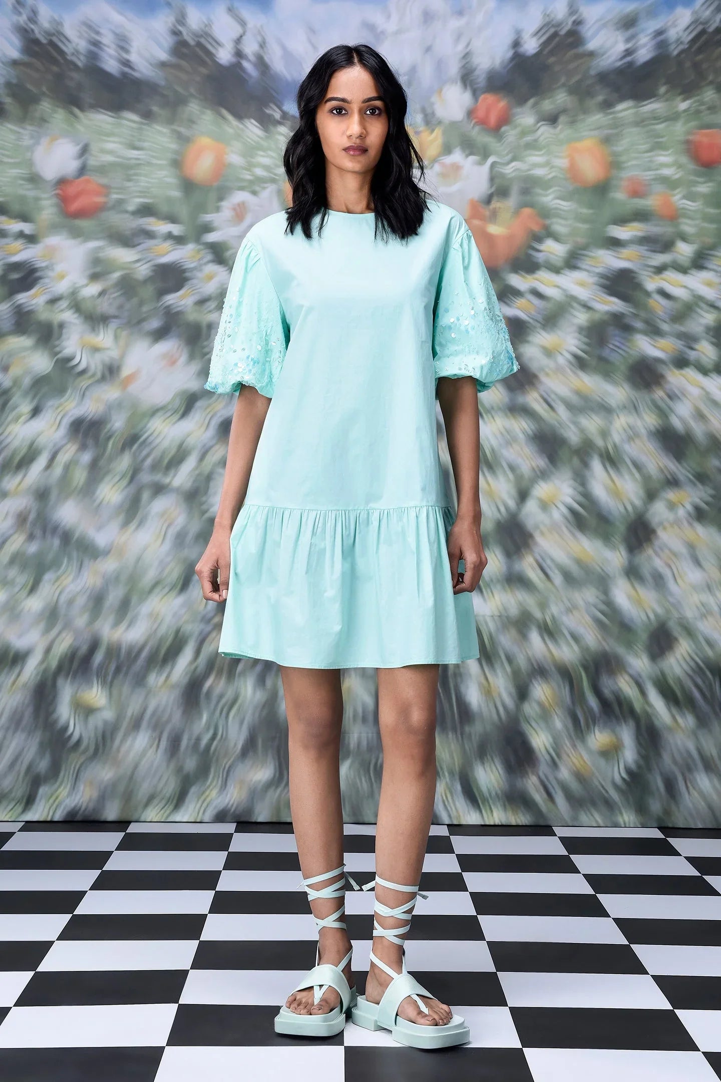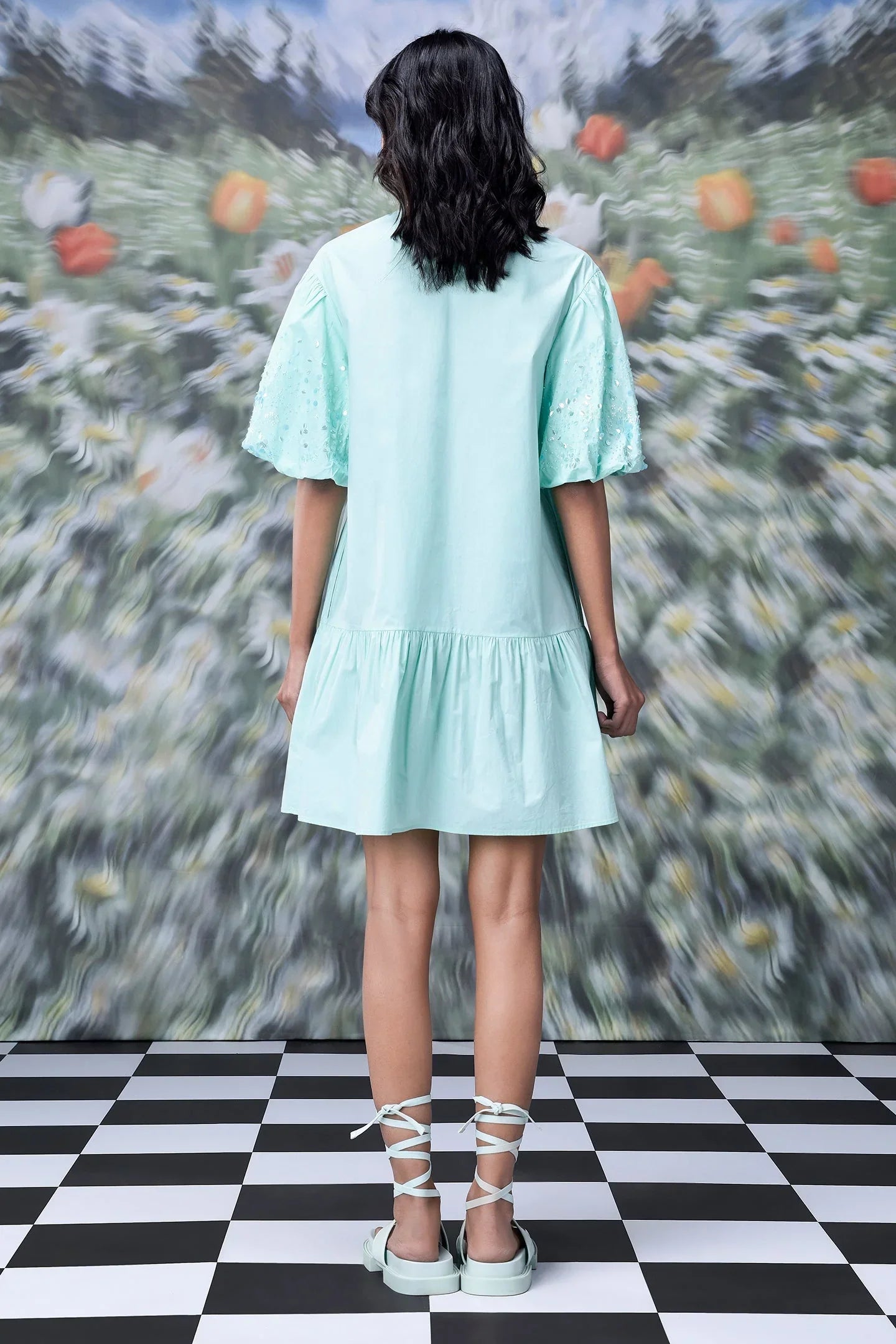 Lightweight fabric ensures you stay comfortable during every event. Subtle sparkling sequins add a modern touch, making it a great choice for both daytime and evening occasions. The dress features short, slightly puffed sleeves that bring a playful yet elegant vibe.